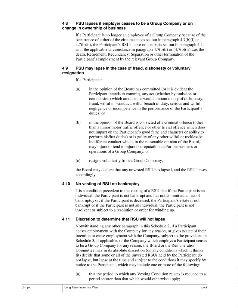 4.8 RSU lapses if employer ceases to be a Group Company or on change in ownership of business If a Participant is no longer an employee of a Group Company because of the occurrence of either of the circumstances set out in paragraph 4.7(b)(i) or 4.7(b)(ii), the Participant’s RSUs lapse on the basis set out in paragraph 4.4, as if the applicable circumstance in paragraph 4.7(b)(i) or (4.7(b)(ii) was the death, Retirement, Redundancy, Separation or other termination of the Participant’s employment by the relevant Group Company. 4.9 RSU may lapse in the case of fraud, dishonesty or voluntary resignation If a Participant: (a) in the opinion of the Board has committed (or it is evident the Participant intends to commit), any act (whether by omission or commission) which amounts or would amount to any of dishonesty, fraud, wilful misconduct, wilful breach of duty, serious and wilful negligence or incompetence in the performance of the Participant’s duties; or (b) in the opinion of the Board is convicted of a criminal offence (other than a minor motor traffic offence or other trivial offence which does not impact on the Participant’s good fame and character or ability to perform his/her duties) or is guilty of any other wilful or recklessly indifferent conduct which, in the reasonable opinion of the Board, may injure or tend to injure the reputation and/or the business or operations of a Group Company; or (c) resigns voluntarily from a Group Company, the Board may declare that any unvested RSU has lapsed, and the RSU lapses accordingly. 4.10 No vesting of RSU on bankruptcy It is a condition precedent to the vesting of a RSU that if the Participant is an individual, the Participant is not bankrupt and has not committed an act of bankruptcy or, if the Participant is deceased, the Participant’s estate is not bankrupt or if the Participant is not an individual, the Participant is not insolvent or subject to a resolution or order for winding up. 4.11 Discretion to determine that RSU will not lapse Notwithstanding any other paragraph in this Schedule 2, if a Participant ceases employment with the Company for any reason, or gives notice of their intention to cease employment with the Company, subject to the provisions in Schedule 3, if applicable, or the Company which employs a Participant ceases to be a Group Company for any reason, the Board or the Remuneration Committee may in its absolute discretion (on any conditions which it thinks fit) decide that some or all of the unvested RSUs held by the Participant do not lapse, but lapse at the time and subject to the conditions it may specify by notice to the Participant, which may include one or more of the following: (a) that the period to which any Vesting Condition relates is reduced to a period shorter than that which would otherwise apply; JHI plc Long Term Incentive Plan xxviii