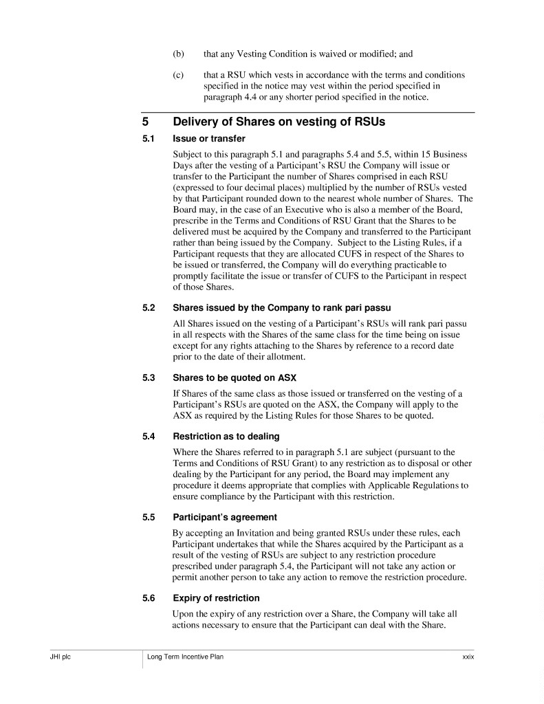 (b) that any Vesting Condition is waived or modified; and (c) that a RSU which vests in accordance with the terms and conditions specified in the notice may vest within the period specified in paragraph 4.4 or any shorter period specified in the notice. 5 Delivery of Shares on vesting of RSUs 5.1 Issue or transfer Subject to this paragraph 5.1 and paragraphs 5.4 and 5.5, within 15 Business Days after the vesting of a Participant’s RSU the Company will issue or transfer to the Participant the number of Shares comprised in each RSU (expressed to four decimal places) multiplied by the number of RSUs vested by that Participant rounded down to the nearest whole number of Shares. The Board may, in the case of an Executive who is also a member of the Board, prescribe in the Terms and Conditions of RSU Grant that the Shares to be delivered must be acquired by the Company and transferred to the Participant rather than being issued by the Company. Subject to the Listing Rules, if a Participant requests that they are allocated CUFS in respect of the Shares to be issued or transferred, the Company will do everything practicable to promptly facilitate the issue or transfer of CUFS to the Participant in respect of those Shares. 5.2 Shares issued by the Company to rank pari passu All Shares issued on the vesting of a Participant’s RSUs will rank pari passu in all respects with the Shares of the same class for the time being on issue except for any rights attaching to the Shares by reference to a record date prior to the date of their allotment. 5.3 Shares to be quoted on ASX If Shares of the same class as those issued or transferred on the vesting of a Participant’s RSUs are quoted on the ASX, the Company will apply to the ASX as required by the Listing Rules for those Shares to be quoted. 5.4 Restriction as to dealing Where the Shares referred to in paragraph 5.1 are subject (pursuant to the Terms and Conditions of RSU Grant) to any restriction as to disposal or other dealing by the Participant for any period, the Board may implement any procedure it deems appropriate that complies with Applicable Regulations to ensure compliance by the Participant with this restriction. 5.5 Participant’s agreement By accepting an Invitation and being granted RSUs under these rules, each Participant undertakes that while the Shares acquired by the Participant as a result of the vesting of RSUs are subject to any restriction procedure prescribed under paragraph 5.4, the Participant will not take any action or permit another person to take any action to remove the restriction procedure. 5.6 Expiry of restriction Upon the expiry of any restriction over a Share, the Company will take all actions necessary to ensure that the Participant can deal with the Share. JHI plc Long Term Incentive Plan xxix