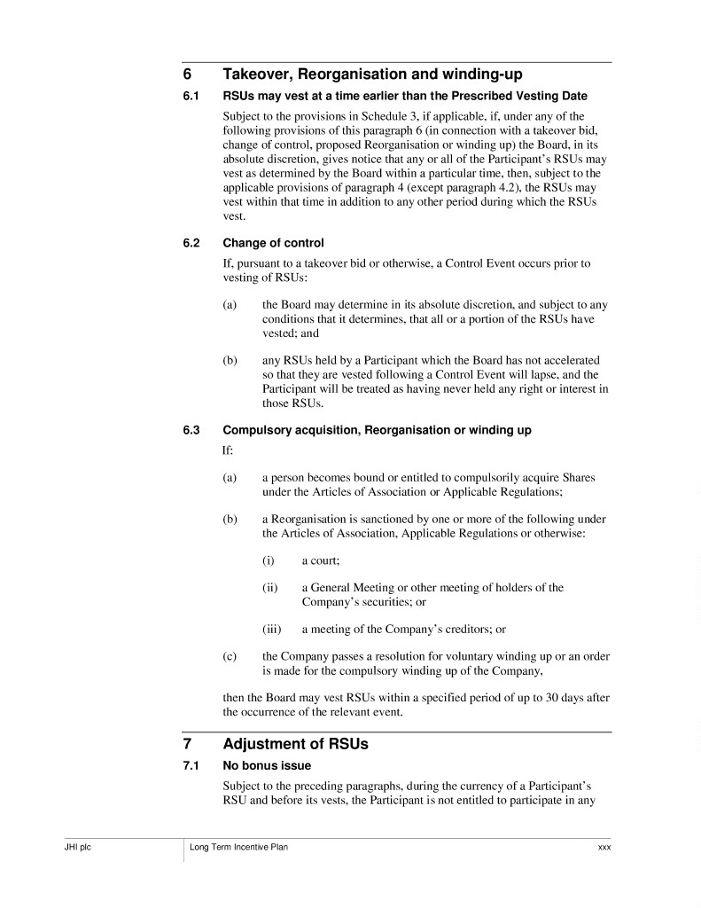 6 Takeover, Reorganisation and winding-up 6.1 RSUs may vest at a time earlier than the Prescribed Vesting Date Subject to the provisions in Schedule 3, if applicable, if, under any of the following provisions of this paragraph 6 (in connection with a takeover bid, change of control, proposed Reorganisation or winding up) the Board, in its absolute discretion, gives notice that any or all of the Participant’s RSUs may vest as determined by the Board within a particular time, then, subject to the applicable provisions of paragraph 4 (except paragraph 4.2), the RSUs may vest within that time in addition to any other period during which the RSUs vest. 6.2 Change of control If, pursuant to a takeover bid or otherwise, a Control Event occurs prior to vesting of RSUs: (a) the Board may determine in its absolute discretion, and subject to any conditions that it determines, that all or a portion of the RSUs have vested; and (b) any RSUs held by a Participant which the Board has not accelerated so that they are vested following a Control Event will lapse, and the Participant will be treated as having never held any right or interest in those RSUs. 6.3 Compulsory acquisition, Reorganisation or winding up If: (a) a person becomes bound or entitled to compulsorily acquire Shares under the Articles of Association or Applicable Regulations; (b) a Reorganisation is sanctioned by one or more of the following under the Articles of Association, Applicable Regulations or otherwise: (i) a court; (ii) a General Meeting or other meeting of holders of the Company’s securities; or (iii) a meeting of the Company’s creditors; or (c) the Company passes a resolution for voluntary winding up or an order is made for the compulsory winding up of the Company, then the Board may vest RSUs within a specified period of up to 30 days after the occurrence of the relevant event. 7 Adjustment of RSUs 7.1 No bonus issue Subject to the preceding paragraphs, during the currency of a Participant’s RSU and before its vests, the Participant is not entitled to participate in any JHI plc Long Term Incentive Plan xxx