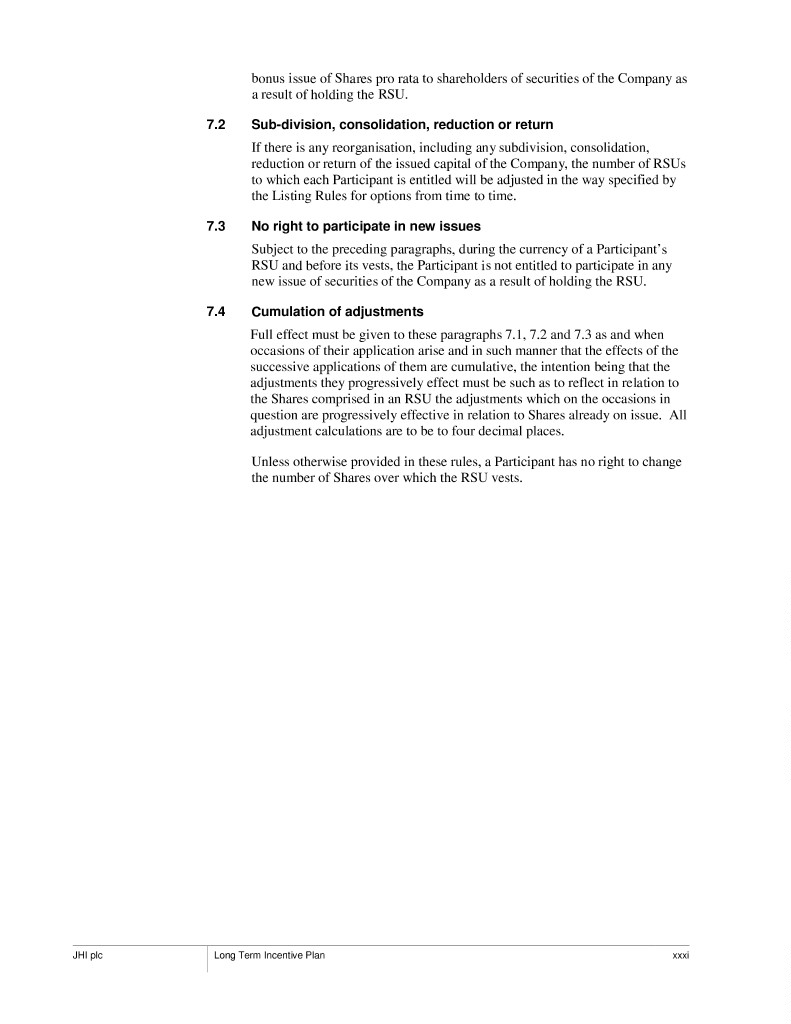 bonus issue of Shares pro rata to shareholders of securities of the Company as a result of holding the RSU. 7.2 Sub-division, consolidation, reduction or return If there is any reorganisation, including any subdivision, consolidation, reduction or return of the issued capital of the Company, the number of RSUs to which each Participant is entitled will be adjusted in the way specified by the Listing Rules for options from time to time. 7.3 No right to participate in new issues Subject to the preceding paragraphs, during the currency of a Participant’s RSU and before its vests, the Participant is not entitled to participate in any new issue of securities of the Company as a result of holding the RSU. 7.4 Cumulation of adjustments Full effect must be given to these paragraphs 7.1, 7.2 and 7.3 as and when occasions of their application arise and in such manner that the effects of the successive applications of them are cumulative, the intention being that the adjustments they progressively effect must be such as to reflect in relation to the Shares comprised in an RSU the adjustments which on the occasions in question are progressively effective in relation to Shares already on issue. All adjustment calculations are to be to four decimal places. Unless otherwise provided in these rules, a Participant has no right to change the number of Shares over which the RSU vests. JHI plc Long Term Incentive Plan xxxi