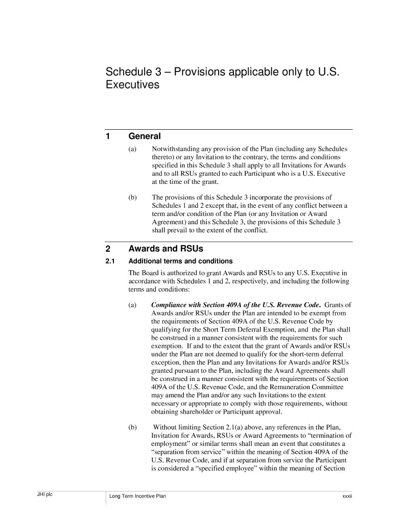 Schedule 3 – Provisions applicable only to U.S. Executives 1 General (a) Notwithstanding any provision of the Plan (including any Schedules thereto) or any Invitation to the contrary, the terms and conditions specified in this Schedule 3 shall apply to all Invitations for Awards and to all RSUs granted to each Participant who is a U.S. Executive at the time of the grant. (b) The provisions of this Schedule 3 incorporate the provisions of Schedules 1 and 2 except that, in the event of any conflict between a term and/or condition of the Plan (or any Invitation or Award Agreement) and this Schedule 3, the provisions of this Schedule 3 shall prevail to the extent of the conflict. 2 Awards and RSUs 2.1 Additional terms and conditions The Board is authorized to grant Awards and RSUs to any U.S. Executive in accordance with Schedules 1 and 2, respectively, and including the following terms and conditions: (a) Compliance with Section 409A of the U.S. Revenue Code . Grants of Awards and/or RSUs under the Plan are intended to be exempt from the requirements of Section 409A of the U.S. Revenue Code by qualifying for the Short Term Deferral Exemption, and the Plan shall be construed in a manner consistent with the requirements for such exemption. If and to the extent that the grant of Awards and/or RSUs under the Plan are not deemed to qualify for the short-term deferral exception, then the Plan and any Invitations for Awards and/or RSUs granted pursuant to the Plan, including the Award Agreements shall be construed in a manner consistent with the requirements of Section 409A of the U.S. Revenue Code, and the Remuneration Committee may amend the Plan and/or any such Invitations to the extent necessary or appropriate to comply with those requirements, without obtaining shareholder or Participant approval. (b) Without limiting Section 2.1(a) above, any references in the Plan, Invitation for Awards, RSUs or Award Agreements to “termination of employment” or similar terms shall mean an event that constitutes a “separation from service” within the meaning of Section 409A of the U.S. Revenue Code, and if at separation from service the Participant is considered a “specified employee” within the meaning of Section JHI plc Long Term Incentive Plan xxxii