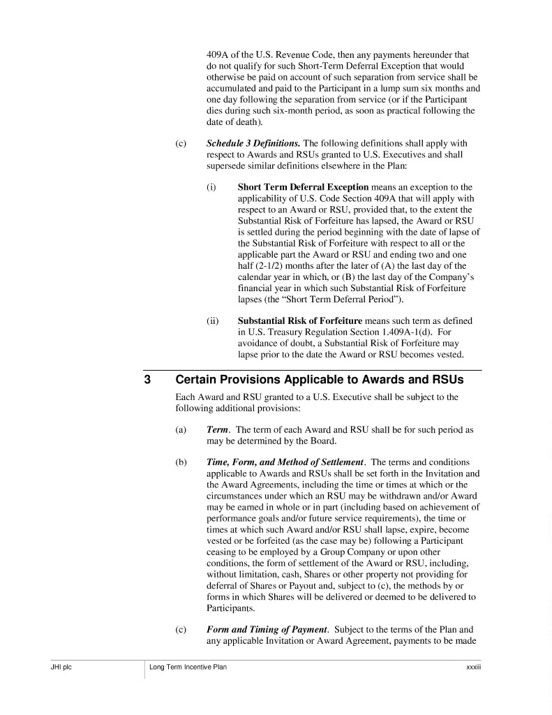 409A of the U.S. Revenue Code, then any payments hereunder that do not qualify for such Short-Term Deferral Exception that would otherwise be paid on account of such separation from service shall be accumulated and paid to the Participant in a lump sum six months and one day following the separation from service (or if the Participant dies during such six-month period, as soon as practical following the date of death). (c) Schedule 3 Definitions. The following definitions shall apply with respect to Awards and RSUs granted to U.S. Executives and shall supersede similar definitions elsewhere in the Plan: (i) Short Term Deferral Exception means an exception to the applicability of U.S. Code Section 409A that will apply with respect to an Award or RSU, provided that, to the extent the Substantial Risk of Forfeiture has lapsed, the Award or RSU is settled during the period beginning with the date of lapse of the Substantial Risk of Forfeiture with respect to all or the applicable part the Award or RSU and ending two and one half (2-1/2) months after the later of (A) the last day of the calendar year in which, or (B) the last day of the Company’s financial year in which such Substantial Risk of Forfeiture lapses (the “Short Term Deferral Period”). (ii) Substantial Risk of Forfeiture means such term as defined in U.S. Treasury Regulation Section 1.409A-1(d). For avoidance of doubt, a Substantial Risk of Forfeiture may lapse prior to the date the Award or RSU becomes vested. 3 Certain Provisions Applicable to Awards and RSUs Each Award and RSU granted to a U.S. Executive shall be subject to the following additional provisions: (a) Term . The term of each Award and RSU shall be for such period as may be determined by the Board. (b) Time, Form, and Method of Settlement . The terms and conditions applicable to Awards and RSUs shall be set forth in the Invitation and the Award Agreements, including the time or times at which or the circumstances under which an RSU may be withdrawn and/or Award may be earned in whole or in part (including based on achievement of performance goals and/or future service requirements), the time or times at which such Award and/or RSU shall lapse, expire, become vested or be forfeited (as the case may be) following a Participant ceasing to be employed by a Group Company or upon other conditions, the form of settlement of the Award or RSU, including, without limitation, cash, Shares or other property not providing for deferral of Shares or Payout and, subject to (c), the methods by or forms in which Shares will be delivered or deemed to be delivered to Participants. (c) Form and Timing of Payment . Subject to the terms of the Plan and any applicable Invitation or Award Agreement, payments to be made JHI plc Long Term Incentive Plan xxxiii