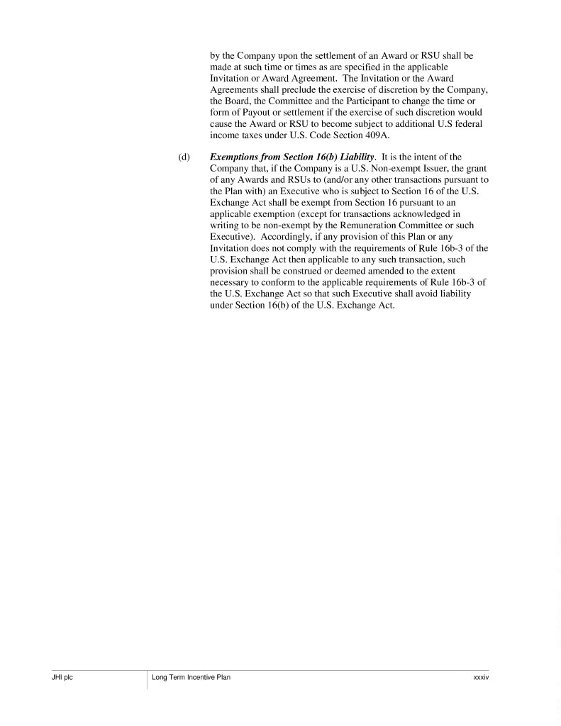 by the Company upon the settlement of an Award or RSU shall be made at such time or times as are specified in the applicable Invitation or Award Agreement. The Invitation or the Award Agreements shall preclude the exercise of discretion by the Company, the Board, the Committee and the Participant to change the time or form of Payout or settlement if the exercise of such discretion would cause the Award or RSU to become subject to additional U.S federal income taxes under U.S. Code Section 409A. (d) Exemptions from Section 16(b) Liability . It is the intent of the Company that, if the Company is a U.S. Non-exempt Issuer, the grant of any Awards and RSUs to (and/or any other transactions pursuant to the Plan with) an Executive who is subject to Section 16 of the U.S. Exchange Act shall be exempt from Section 16 pursuant to an applicable exemption (except for transactions acknowledged in writing to be non-exempt by the Remuneration Committee or such Executive). Accordingly, if any provision of this Plan or any Invitation does not comply with the requirements of Rule 16b-3 of the U.S. Exchange Act then applicable to any such transaction, such provision shall be construed or deemed amended to the extent necessary to conform to the applicable requirements of Rule 16b-3 of the U.S. Exchange Act so that such Executive shall avoid liability under Section 16(b) of the U.S. Exchange Act. JHI plc Long Term Incentive Plan xxxiv