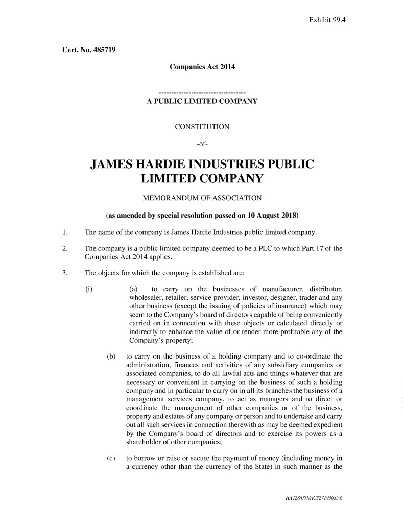 Exhibit 99.4 Cert. No. 485719 Companies Act 2014 ----------------------------------- A PUBLIC LIMITED COMPANY ----------------------------------- CONSTITUTION -of- JAMES HARDIE INDUSTRIES PUBLIC LIMITED COMPANY MEMORANDUM OF ASSOCIATION (as amended by special resolution passed on 10 August 2018) 1. The name of the company is James Hardie Industries public limited company. 2. The company is a public limited company deemed to be a PLC to which Part 17 of the Companies Act 2014 applies. 3. The objects for which the company is established are: (i) (a) to carry on the businesses of manufacturer, distributor, wholesaler, retailer, service provider, investor, designer, trader and any other business (except the issuing of policies of insurance) which may seem to the Company’s board of directors capable of being conveniently carried on in connection with these objects or calculated directly or indirectly to enhance the value of or render more profitable any of the Company’s property; (b) to carry on the business of a holding company and to co-ordinate the administration, finances and activities of any subsidiary companies or associated companies, to do all lawful acts and things whatever that are necessary or convenient in carrying on the business of such a holding company and in particular to carry on in all its branches the business of a management services company, to act as managers and to direct or coordinate the management of other companies or of the business, property and estates of any company or person and to undertake and carry out all such services in connection therewith as may be deemed expedient by the Company’s board of directors and to exercise its powers as a shareholder of other companies; (c) to borrow or raise or secure the payment of money (including money in a currency other than the currency of the State) in such manner as the HA228/001/AC#27193635.6