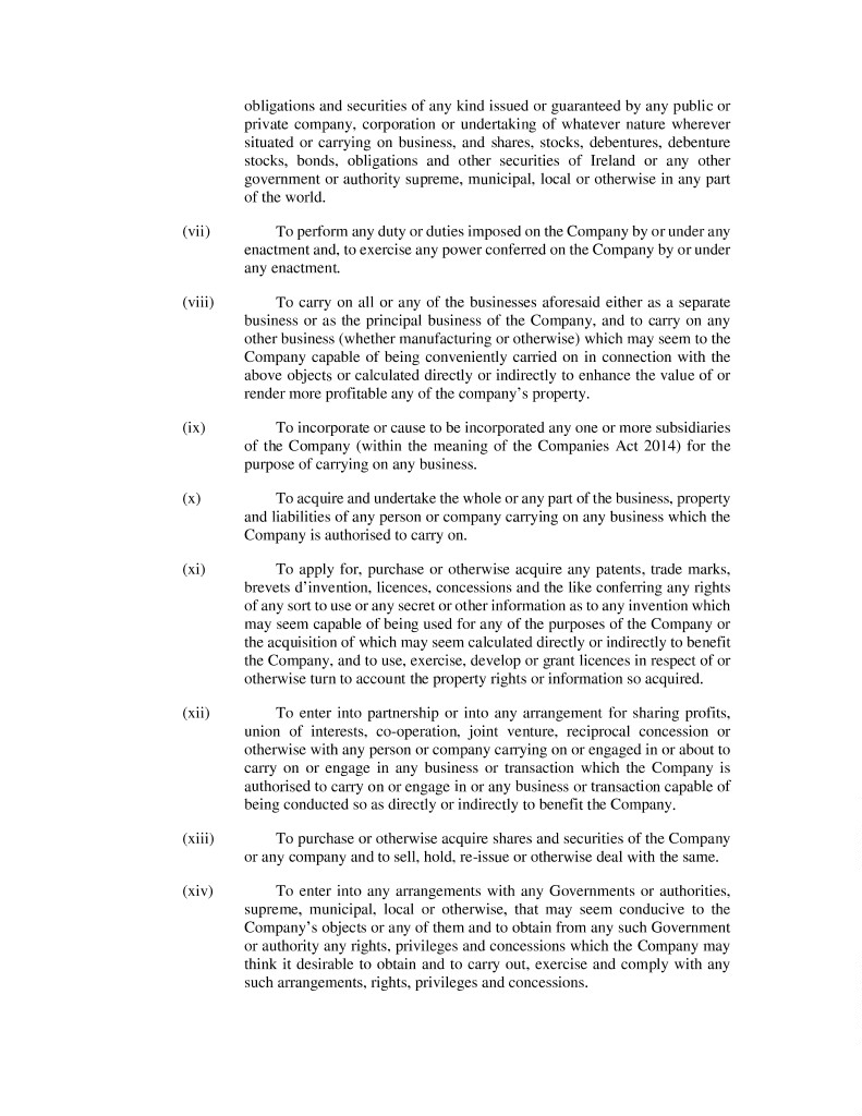 obligations and securities of any kind issued or guaranteed by any public or private company, corporation or undertaking of whatever nature wherever situated or carrying on business, and shares, stocks, debentures, debenture stocks, bonds, obligations and other securities of Ireland or any other government or authority supreme, municipal, local or otherwise in any part of the world. (vii) To perform any duty or duties imposed on the Company by or under any enactment and, to exercise any power conferred on the Company by or under any enactment. (viii) To carry on all or any of the businesses aforesaid either as a separate business or as the principal business of the Company, and to carry on any other business (whether manufacturing or otherwise) which may seem to the Company capable of being conveniently carried on in connection with the above objects or calculated directly or indirectly to enhance the value of or render more profitable any of the company’s property. (ix) To incorporate or cause to be incorporated any one or more subsidiaries of the Company (within the meaning of the Companies Act 2014) for the purpose of carrying on any business. (x) To acquire and undertake the whole or any part of the business, property and liabilities of any person or company carrying on any business which the Company is authorised to carry on. (xi) To apply for, purchase or otherwise acquire any patents, trade marks, brevets d’invention, licences, concessions and the like conferring any rights of any sort to use or any secret or other information as to any invention which may seem capable of being used for any of the purposes of the Company or the acquisition of which may seem calculated directly or indirectly to benefit the Company, and to use, exercise, develop or grant licences in respect of or otherwise turn to account the property rights or information so acquired. (xii) To enter into partnership or into any arrangement for sharing profits, union of interests, co-operation, joint venture, reciprocal concession or otherwise with any person or company carrying on or engaged in or about to carry on or engage in any business or transaction which the Company is authorised to carry on or engage in or any business or transaction capable of being conducted so as directly or indirectly to benefit the Company. (xiii) To purchase or otherwise acquire shares and securities of the Company or any company and to sell, hold, re-issue or otherwise deal with the same. (xiv) To enter into any arrangements with any Governments or authorities, supreme, municipal, local or otherwise, that may seem conducive to the Company’s objects or any of them and to obtain from any such Government or authority any rights, privileges and concessions which the Company may think it desirable to obtain and to carry out, exercise and comply with any such arrangements, rights, privileges and concessions.
