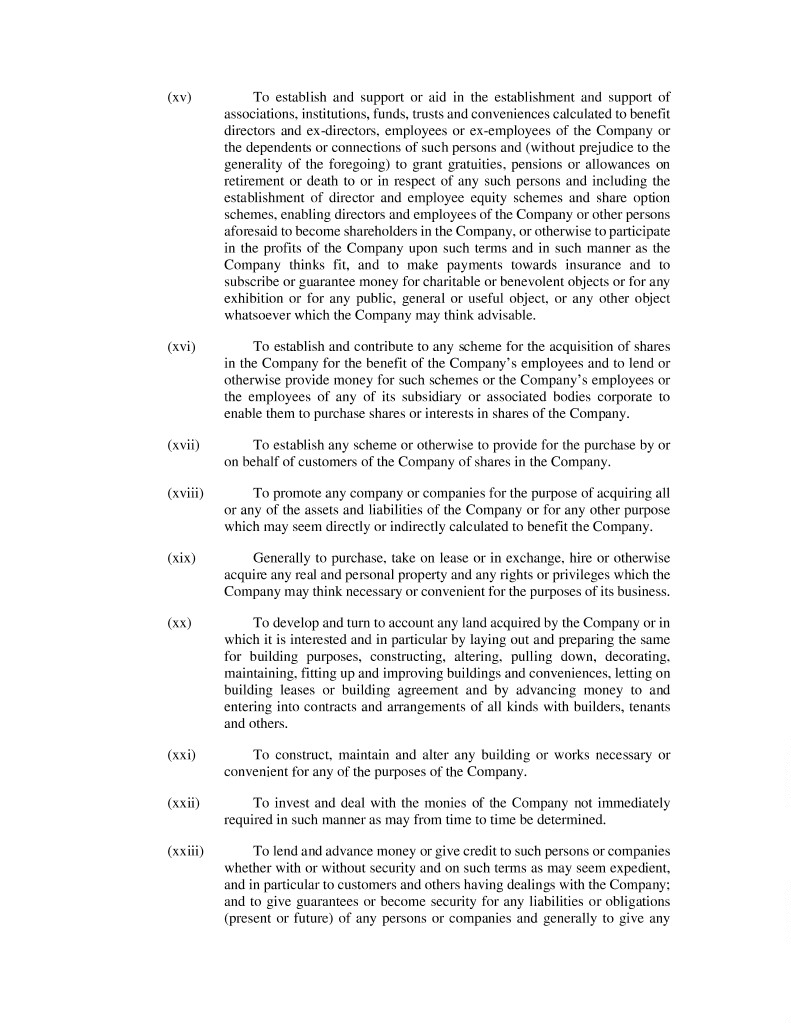 (xv) To establish and support or aid in the establishment and support of associations, institutions, funds, trusts and conveniences calculated to benefit directors and ex-directors, employees or ex-employees of the Company or the dependents or connections of such persons and (without prejudice to the generality of the foregoing) to grant gratuities, pensions or allowances on retirement or death to or in respect of any such persons and including the establishment of director and employee equity schemes and share option schemes, enabling directors and employees of the Company or other persons aforesaid to become shareholders in the Company, or otherwise to participate in the profits of the Company upon such terms and in such manner as the Company thinks fit, and to make payments towards insurance and to subscribe or guarantee money for charitable or benevolent objects or for any exhibition or for any public, general or useful object, or any other object whatsoever which the Company may think advisable. (xvi) To establish and contribute to any scheme for the acquisition of shares in the Company for the benefit of the Company’s employees and to lend or otherwise provide money for such schemes or the Company’s employees or the employees of any of its subsidiary or associated bodies corporate to enable them to purchase shares or interests in shares of the Company. (xvii) To establish any scheme or otherwise to provide for the purchase by or on behalf of customers of the Company of shares in the Company. (xviii) To promote any company or companies for the purpose of acquiring all or any of the assets and liabilities of the Company or for any other purpose which may seem directly or indirectly calculated to benefit the Company. (xix) Generally to purchase, take on lease or in exchange, hire or otherwise acquire any real and personal property and any rights or privileges which the Company may think necessary or convenient for the purposes of its business. (xx) To develop and turn to account any land acquired by the Company or in which it is interested and in particular by laying out and preparing the same for building purposes, constructing, altering, pulling down, decorating, maintaining, fitting up and improving buildings and conveniences, letting on building leases or building agreement and by advancing money to and entering into contracts and arrangements of all kinds with builders, tenants and others. (xxi) To construct, maintain and alter any building or works necessary or convenient for any of the purposes of the Company. (xxii) To invest and deal with the monies of the Company not immediately required in such manner as may from time to time be determined. (xxiii) To lend and advance money or give credit to such persons or companies whether with or without security and on such terms as may seem expedient, and in particular to customers and others having dealings with the Company; and to give guarantees or become security for any liabilities or obligations (present or future) of any persons or companies and generally to give any