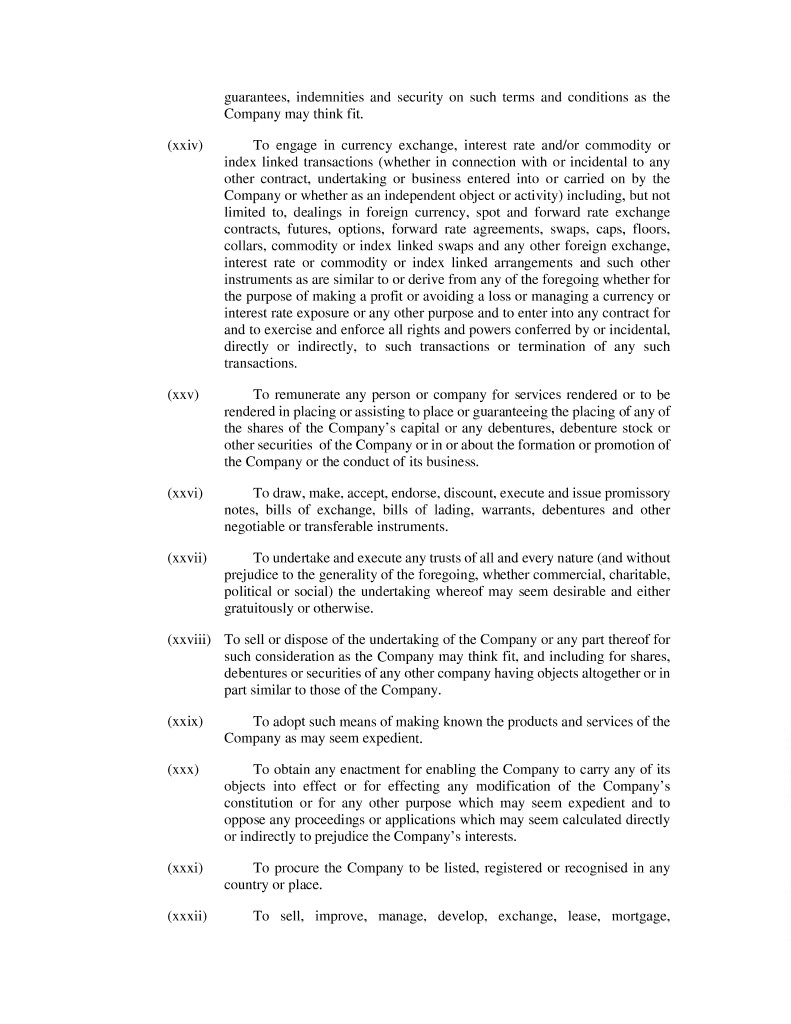 guarantees, indemnities and security on such terms and conditions as the Company may think fit. (xxiv) To engage in currency exchange, interest rate and/or commodity or index linked transactions (whether in connection with or incidental to any other contract, undertaking or business entered into or carried on by the Company or whether as an independent object or activity) including, but not limited to, dealings in foreign currency, spot and forward rate exchange contracts, futures, options, forward rate agreements, swaps, caps, floors, collars, commodity or index linked swaps and any other foreign exchange, interest rate or commodity or index linked arrangements and such other instruments as are similar to or derive from any of the foregoing whether for the purpose of making a profit or avoiding a loss or managing a currency or interest rate exposure or any other purpose and to enter into any contract for and to exercise and enforce all rights and powers conferred by or incidental, directly or indirectly, to such transactions or termination of any such transactions. (xxv) To remunerate any person or company for services rendered or to be rendered in placing or assisting to place or guaranteeing the placing of any of the shares of the Company’s capital or any debentures, debenture stock or other securities of the Company or in or about the formation or promotion of the Company or the conduct of its business. (xxvi) To draw, make, accept, endorse, discount, execute and issue promissory notes, bills of exchange, bills of lading, warrants, debentures and other negotiable or transferable instruments. (xxvii) To undertake and execute any trusts of all and every nature (and without prejudice to the generality of the foregoing, whether commercial, charitable, political or social) the undertaking whereof may seem desirable and either gratuitously or otherwise. (xxviii) To sell or dispose of the undertaking of the Company or any part thereof for such consideration as the Company may think fit, and including for shares, debentures or securities of any other company having objects altogether or in part similar to those of the Company. (xxix) To adopt such means of making known the products and services of the Company as may seem expedient. (xxx) To obtain any enactment for enabling the Company to carry any of its objects into effect or for effecting any modification of the Company’s constitution or for any other purpose which may seem expedient and to oppose any proceedings or applications which may seem calculated directly or indirectly to prejudice the Company’s interests. (xxxi) To procure the Company to be listed, registered or recognised in any country or place. (xxxii) To sell, improve, manage, develop, exchange, lease, mortgage,