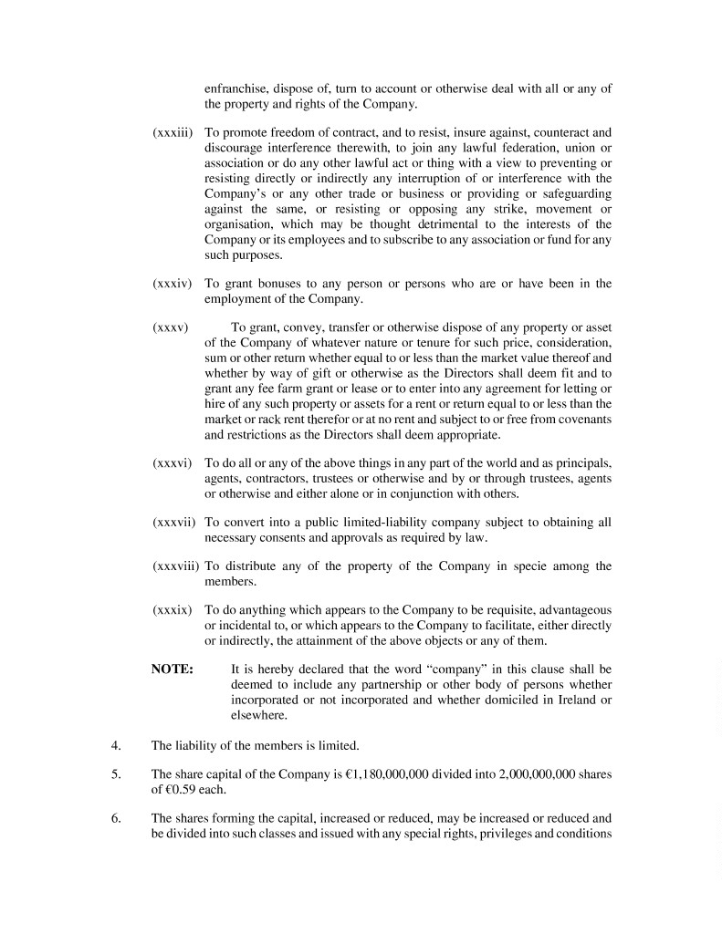 enfranchise, dispose of, turn to account or otherwise deal with all or any of the property and rights of the Company. (xxxiii) To promote freedom of contract, and to resist, insure against, counteract and discourage interference therewith, to join any lawful federation, union or association or do any other lawful act or thing with a view to preventing or resisting directly or indirectly any interruption of or interference with the Company’s or any other trade or business or providing or safeguarding against the same, or resisting or opposing any strike, movement or organisation, which may be thought detrimental to the interests of the Company or its employees and to subscribe to any association or fund for any such purposes. (xxxiv) To grant bonuses to any person or persons who are or have been in the employment of the Company. (xxxv) To grant, convey, transfer or otherwise dispose of any property or asset of the Company of whatever nature or tenure for such price, consideration, sum or other return whether equal to or less than the market value thereof and whether by way of gift or otherwise as the Directors shall deem fit and to grant any fee farm grant or lease or to enter into any agreement for letting or hire of any such property or assets for a rent or return equal to or less than the market or rack rent therefor or at no rent and subject to or free from covenants and restrictions as the Directors shall deem appropriate. (xxxvi) To do all or any of the above things in any part of the world and as principals, agents, contractors, trustees or otherwise and by or through trustees, agents or otherwise and either alone or in conjunction with others. (xxxvii) To convert into a public limited-liability company subject to obtaining all necessary consents and approvals as required by law. (xxxviii) To distribute any of the property of the Company in specie among the members. (xxxix) To do anything which appears to the Company to be requisite, advantageous or incidental to, or which appears to the Company to facilitate, either directly or indirectly, the attainment of the above objects or any of them. NOTE: It is hereby declared that the word “company” in this clause shall be deemed to include any partnership or other body of persons whether incorporated or not incorporated and whether domiciled in Ireland or elsewhere. 4. The liability of the members is limited. 5. The share capital of the Company is €1,180,000,000 divided into 2,000,000,000 shares of €0.59 each. 6. The shares forming the capital, increased or reduced, may be increased or reduced and be divided into such classes and issued with any special rights, privileges and conditions
