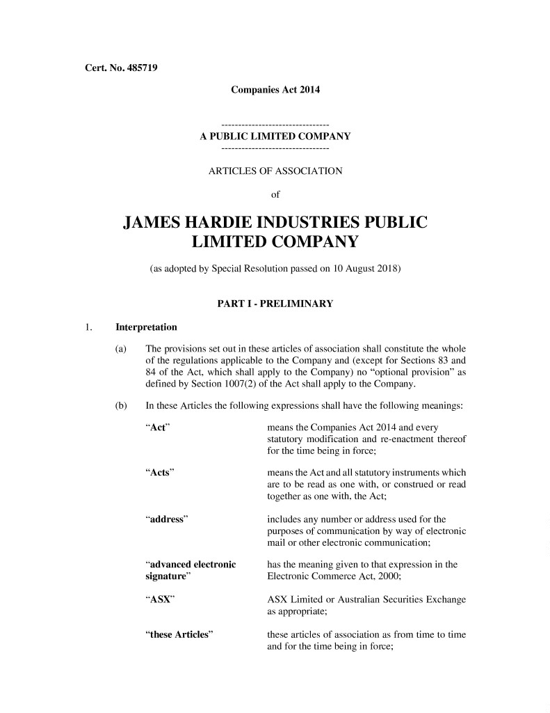 Cert. No. 485719 Companies Act 2014 -------------------------------- A PUBLIC LIMITED COMPANY -------------------------------- ARTICLES OF ASSOCIATION of JAMES HARDIE INDUSTRIES PUBLIC LIMITED COMPANY (as adopted by Special Resolution passed on 10 August 2018) PART I - PRELIMINARY 1. Interpretation (a) The provisions set out in these articles of association shall constitute the whole of the regulations applicable to the Company and (except for Sections 83 and 84 of the Act, which shall apply to the Company) no “optional provision” as defined by Section 1007(2) of the Act shall apply to the Company. (b) In these Articles the following expressions shall have the following meanings: “Act ” means the Companies Act 2014 and every statutory modification and re-enactment thereof for the time being in force; “Acts” means the Act and all statutory instruments which are to be read as one with, or construed or read together as one with, the Act; “address ” includes any number or address used for the purposes of communication by way of electronic mail or other electronic communication; “advanced electronic has the meaning given to that expression in the signature ” Electronic Commerce Act, 2000; “ASX ” ASX Limited or Australian Securities Exchange as appropriate; “these Articles ” these articles of association as from time to time and for the time being in force;