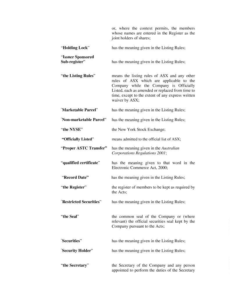 or, where the context permits, the members whose names are entered in the Register as the joint holders of shares; “Holding Lock ” has the meaning given in the Listing Rules; “Issuer Sponsored Sub-register ” has the meaning given in the Listing Rules; “the Listing Rules ” means the listing rules of ASX and any other rules of ASX which are applicable to the Company while the Company is Officially Listed, each as amended or replaced from time to time, except to the extent of any express written waiver by ASX; “Marketable Parcel ” has the meaning given in the Listing Rules; “Non-marketable Parcel ” has the meaning given in the Listing Rules; “the NYSE ” the New York Stock Exchange; “Officially Listed ” means admitted to the official list of ASX; “Proper ASTC Transfer” has the meaning given in the Australian Corporations Regulations 2001 ; “qualified certificate ” has the meaning given to that word in the Electronic Commerce Act, 2000; “Record Date” has the meaning given in the Listing Rules; “the Register ” the register of members to be kept as required by the Acts; “Restricted Securities ” has the meaning given in the Listing Rules; “the Seal ” the common seal of the Company or (where relevant) the official securities seal kept by the Company pursuant to the Acts; “Securities ” has the meaning given in the Listing Rules; “Security Holder ” has the meaning given in the Listing Rules; “the Secretary ” the Secretary of the Company and any person appointed to perform the duties of the Secretary