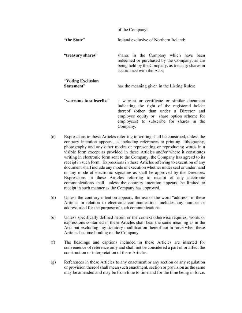 of the Company; “the State ” Ireland exclusive of Northern Ireland; “treasury shares ” shares in the Company which have been redeemed or purchased by the Company, as are being held by the Company, as treasury shares in accordance with the Acts; “Voting Exclusion Statement ” has the meaning given in the Listing Rules; “warrants to subscribe ” a warrant or certificate or similar document indicating the right of the registered holder thereof (other than under a Director and employee equity or share option scheme for employees) to subscribe for shares in the Company. (c) Expressions in these Articles referring to writing shall be construed, unless the contrary intention appears, as including references to printing, lithography, photography and any other modes or representing or reproducing words in a visible form except as provided in these Articles and/or where it constitutes writing in electronic form sent to the Company, the Company has agreed to its receipt in such form. Expressions in these Articles referring to execution of any document shall include any mode of execution whether under seal or under hand or any mode of electronic signature as shall be approved by the Directors. Expressions in these Articles referring to receipt of any electronic communications shall, unless the contrary intention appears, be limited to receipt in such manner as the Company has approved. (d) Unless the contrary intention appears, the use of the word “address” in these Articles in relation to electronic communications includes any number or address used for the purpose of such communications. (e) Unless specifically defined herein or the context otherwise requires, words or expressions contained in these Articles shall bear the same meaning as in the Acts but excluding any statutory modification thereof not in force when these Articles become binding on the Company. (f) The headings and captions included in these Articles are inserted for convenience of reference only and shall not be considered a part of or affect the construction or interpretation of these Articles. (g) References in these Articles to any enactment or any section or any regulation or provision thereof shall mean such enactment, section or provision as the same may be amended and may be from time to time and for the time being in force.