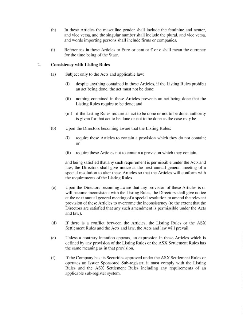 (h) In these Articles the masculine gender shall include the feminine and neuter, and vice versa, and the singular number shall include the plural, and vice versa, and words importing persons shall include firms or companies. (i) References in these Articles to Euro or cent or € or c shall mean the currency for the time being of the State. 2. Consistency with Listing Rules (a) Subject only to the Acts and applicable law: (i) despite anything contained in these Articles, if the Listing Rules prohibit an act being done, the act must not be done; (ii) nothing contained in these Articles prevents an act being done that the Listing Rules require to be done; and (iii) if the Listing Rules require an act to be done or not to be done, authority is given for that act to be done or not to be done as the case may be. (b) Upon the Directors becoming aware that the Listing Rules: (i) require these Articles to contain a provision which they do not contain; or (ii) require these Articles not to contain a provision which they contain, and being satisfied that any such requirement is permissible under the Acts and law, the Directors shall give notice at the next annual general meeting of a special resolution to alter these Articles so that the Articles will conform with the requirements of the Listing Rules. (c) Upon the Directors becoming aware that any provision of these Articles is or will become inconsistent with the Listing Rules, the Directors shall give notice at the next annual general meeting of a special resolution to amend the relevant provision of these Articles to overcome the inconsistency (to the extent that the Directors are satisfied that any such amendment is permissible under the Acts and law). (d) If there is a conflict between the Articles, the Listing Rules or the ASX Settlement Rules and the Acts and law, the Acts and law will prevail. (e) Unless a contrary intention appears, an expression in these Articles which is defined by any provision of the Listing Rules or the ASX Settlement Rules has the same meaning as in that provision. (f) If the Company has its Securities approved under the ASX Settlement Rules or operates an Issuer Sponsored Sub-register, it must comply with the Listing Rules and the ASX Settlement Rules including any requirements of an applicable sub-register system.