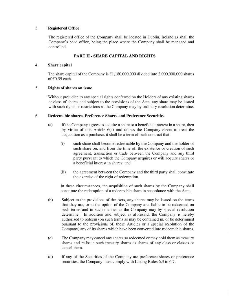 3. Registered Office The registered office of the Company shall be located in Dublin, Ireland as shall the Company’s head office, being the place where the Company shall be managed and controlled. PART II - SHARE CAPITAL AND RIGHTS 4. Share capital The share capital of the Company is €1,180,000,000 divided into 2,000,000,000 shares of €0.59 each. 5. Rights of shares on issue Without prejudice to any special rights conferred on the Holders of any existing shares or class of shares and subject to the provisions of the Acts, any share may be issued with such rights or restrictions as the Company may by ordinary resolution determine. 6. Redeemable shares, Preference Shares and Preference Securities (a) If the Company agrees to acquire a share or a beneficial interest in a share, then by virtue of this Article 6(a) and unless the Company elects to treat the acquisition as a purchase, it shall be a term of such contract that: (i) such share shall become redeemable by the Company and the holder of such share on, and from the time of, the existence or creation of such agreement, transaction or trade between the Company and any third party pursuant to which the Company acquires or will acquire shares or a beneficial interest in shares; and (ii) the agreement between the Company and the third party shall constitute the exercise of the right of redemption. In these circumstances, the acquisition of such shares by the Company shall constitute the redemption of a redeemable share in accordance with the Acts. (b) Subject to the provisions of the Acts, any shares may be issued on the terms that they are, or at the option of the Company are, liable to be redeemed on such terms and in such manner as the Company may by special resolution determine. In addition and subject as aforesaid, the Company is hereby authorised to redeem (on such terms as may be contained in, or be determined pursuant to the provisions of, these Articles or a special resolution of the Company) any of its shares which have been converted into redeemable shares. (c) The Company may cancel any shares so redeemed or may hold them as treasury shares and re-issue such treasury shares as shares of any class or classes or cancel them. (d) If any of the Securities of the Company are preference shares or preference securities, the Company must comply with Listing Rules 6.3 to 6.7.