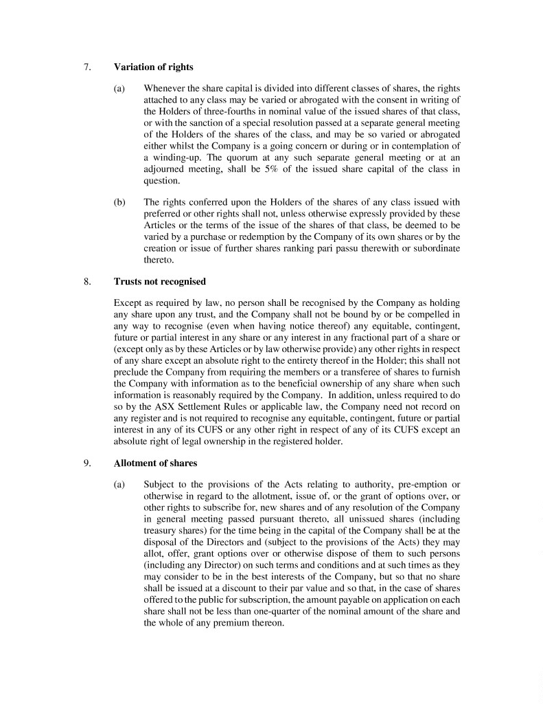 7. Variation of rights (a) Whenever the share capital is divided into different classes of shares, the rights attached to any class may be varied or abrogated with the consent in writing of the Holders of three-fourths in nominal value of the issued shares of that class, or with the sanction of a special resolution passed at a separate general meeting of the Holders of the shares of the class, and may be so varied or abrogated either whilst the Company is a going concern or during or in contemplation of a winding-up. The quorum at any such separate general meeting or at an adjourned meeting, shall be 5% of the issued share capital of the class in question. (b) The rights conferred upon the Holders of the shares of any class issued with preferred or other rights shall not, unless otherwise expressly provided by these Articles or the terms of the issue of the shares of that class, be deemed to be varied by a purchase or redemption by the Company of its own shares or by the creation or issue of further shares ranking pari passu therewith or subordinate thereto. 8. Trusts not recognised Except as required by law, no person shall be recognised by the Company as holding any share upon any trust, and the Company shall not be bound by or be compelled in any way to recognise (even when having notice thereof) any equitable, contingent, future or partial interest in any share or any interest in any fractional part of a share or (except only as by these Articles or by law otherwise provide) any other rights in respect of any share except an absolute right to the entirety thereof in the Holder; this shall not preclude the Company from requiring the members or a transferee of shares to furnish the Company with information as to the beneficial ownership of any share when such information is reasonably required by the Company. In addition, unless required to do so by the ASX Settlement Rules or applicable law, the Company need not record on any register and is not required to recognise any equitable, contingent, future or partial interest in any of its CUFS or any other right in respect of any of its CUFS except an absolute right of legal ownership in the registered holder. 9. Allotment of shares (a) Subject to the provisions of the Acts relating to authority, pre-emption or otherwise in regard to the allotment, issue of, or the grant of options over, or other rights to subscribe for, new shares and of any resolution of the Company in general meeting passed pursuant thereto, all unissued shares (including treasury shares) for the time being in the capital of the Company shall be at the disposal of the Directors and (subject to the provisions of the Acts) they may allot, offer, grant options over or otherwise dispose of them to such persons (including any Director) on such terms and conditions and at such times as they may consider to be in the best interests of the Company, but so that no share shall be issued at a discount to their par value and so that, in the case of shares offered to the public for subscription, the amount payable on application on each share shall not be less than one-quarter of the nominal amount of the share and the whole of any premium thereon.