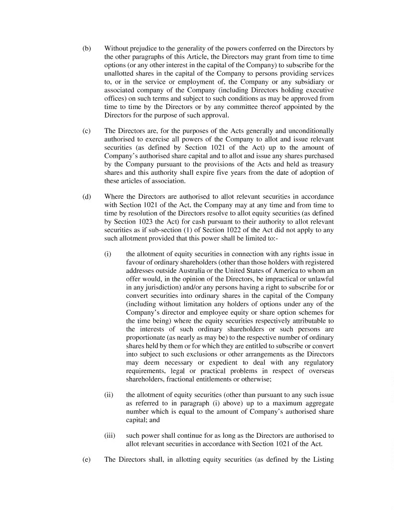 (b) Without prejudice to the generality of the powers conferred on the Directors by the other paragraphs of this Article, the Directors may grant from time to time options (or any other interest in the capital of the Company) to subscribe for the unallotted shares in the capital of the Company to persons providing services to, or in the service or employment of, the Company or any subsidiary or associated company of the Company (including Directors holding executive offices) on such terms and subject to such conditions as may be approved from time to time by the Directors or by any committee thereof appointed by the Directors for the purpose of such approval. (c) The Directors are, for the purposes of the Acts generally and unconditionally authorised to exercise all powers of the Company to allot and issue relevant securities (as defined by Section 1021 of the Act) up to the amount of Company’s authorised share capital and to allot and issue any shares purchased by the Company pursuant to the provisions of the Acts and held as treasury shares and this authority shall expire five years from the date of adoption of these articles of association. (d) Where the Directors are authorised to allot relevant securities in accordance with Section 1021 of the Act, the Company may at any time and from time to time by resolution of the Directors resolve to allot equity securities (as defined by Section 1023 the Act) for cash pursuant to their authority to allot relevant securities as if sub-section (1) of Section 1022 of the Act did not apply to any such allotment provided that this power shall be limited to:- (i) the allotment of equity securities in connection with any rights issue in favour of ordinary shareholders (other than those holders with registered addresses outside Australia or the United States of America to whom an offer would, in the opinion of the Directors, be impractical or unlawful in any jurisdiction) and/or any persons having a right to subscribe for or convert securities into ordinary shares in the capital of the Company (including without limitation any holders of options under any of the Company’s director and employee equity or share option schemes for the time being) where the equity securities respectively attributable to the interests of such ordinary shareholders or such persons are proportionate (as nearly as may be) to the respective number of ordinary shares held by them or for which they are entitled to subscribe or convert into subject to such exclusions or other arrangements as the Directors may deem necessary or expedient to deal with any regulatory requirements, legal or practical problems in respect of overseas shareholders, fractional entitlements or otherwise; (ii) the allotment of equity securities (other than pursuant to any such issue as referred to in paragraph (i) above) up to a maximum aggregate number which is equal to the amount of Company’s authorised share capital; and (iii) such power shall continue for as long as the Directors are authorised to allot relevant securities in accordance with Section 1021 of the Act. (e) The Directors shall, in allotting equity securities (as defined by the Listing
