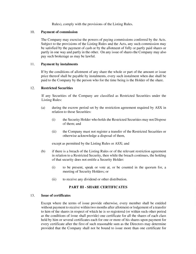 Rules), comply with the provisions of the Listing Rules. 10. Payment of commission The Company may exercise the powers of paying commissions conferred by the Acts. Subject to the provisions of the Listing Rules and the Acts, any such commission may be satisfied by the payment of cash or by the allotment of fully or partly paid shares or partly in one way and partly in the other. On any issue of shares the Company may also pay such brokerage as may be lawful. 11. Payment by instalments If by the conditions of allotment of any share the whole or part of the amount or issue price thereof shall be payable by instalments, every such instalment when due shall be paid to the Company by the person who for the time being is the Holder of the share. 12. Restricted Securities If any Securities of the Company are classified as Restricted Securities under the Listing Rules: (a) during the escrow period set by the restriction agreement required by ASX in relation to those Securities: (i) the Security Holder who holds the Restricted Securities may not Dispose of them; and (ii) the Company must not register a transfer of the Restricted Securities or otherwise acknowledge a disposal of them, except as permitted by the Listing Rules or ASX; and (b) if there is a breach of the Listing Rules or of the relevant restriction agreement in relation to a Restricted Security, then while the breach continues, the holding of that security does not entitle a Security Holder: (i) to be present, speak or vote at, or be counted in the quorum for, a meeting of Security Holders; or (ii) to receive any dividend or other distribution. PART III - SHARE CERTIFICATES 13. Issue of certificates Except where the terms of issue provide otherwise, every member shall be entitled without payment to receive within two months after allotment or lodgement of a transfer to him of the shares in respect of which he is so registered (or within such other period as the conditions of issue shall provide) one certificate for all the shares of each class held by him or several certificates each for one or more of his shares upon payment for every certificate after the first of such reasonable sum as the Directors may determine provided that the Company shall not be bound to issue more than one certificate for