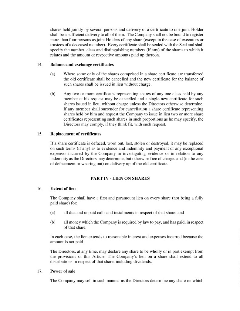 shares held jointly by several persons and delivery of a certificate to one joint Holder shall be a sufficient delivery to all of them. The Company shall not be bound to register more than four persons as joint Holders of any share (except in the case of executors or trustees of a deceased member). Every certificate shall be sealed with the Seal and shall specify the number, class and distinguishing numbers (if any) of the shares to which it relates and the amount or respective amounts paid up thereon. 14. Balance and exchange certificates (a) Where some only of the shares comprised in a share certificate are transferred the old certificate shall be cancelled and the new certificate for the balance of such shares shall be issued in lieu without charge. (b) Any two or more certificates representing shares of any one class held by any member at his request may be cancelled and a single new certificate for such shares issued in lieu, without charge unless the Directors otherwise determine. If any member shall surrender for cancellation a share certificate representing shares held by him and request the Company to issue in lieu two or more share certificates representing such shares in such proportions as he may specify, the Directors may comply, if they think fit, with such request. 15. Replacement of certificates If a share certificate is defaced, worn out, lost, stolen or destroyed, it may be replaced on such terms (if any) as to evidence and indemnity and payment of any exceptional expenses incurred by the Company in investigating evidence or in relation to any indemnity as the Directors may determine, but otherwise free of charge, and (in the case of defacement or wearing out) on delivery up of the old certificate. PART IV - LIEN ON SHARES 16. Extent of lien The Company shall have a first and paramount lien on every share (not being a fully paid share) for: (a) all due and unpaid calls and instalments in respect of that share; and (b) all money which the Company is required by law to pay, and has paid, in respect of that share. In each case, the lien extends to reasonable interest and expenses incurred because the amount is not paid. The Directors, at any time, may declare any share to be wholly or in part exempt from the provisions of this Article. The Company’s lien on a share shall extend to all distributions in respect of that share, including dividends. 17. Power of sale The Company may sell in such manner as the Directors determine any share on which