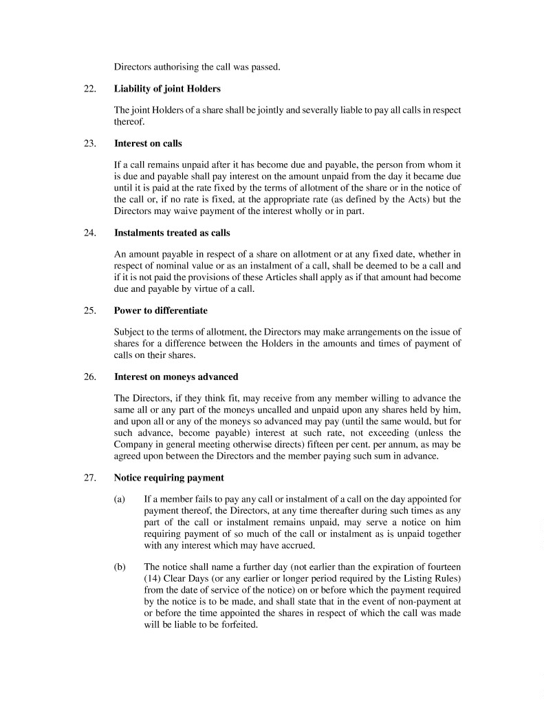 Directors authorising the call was passed. 22. Liability of joint Holders The joint Holders of a share shall be jointly and severally liable to pay all calls in respect thereof. 23. Interest on calls If a call remains unpaid after it has become due and payable, the person from whom it is due and payable shall pay interest on the amount unpaid from the day it became due until it is paid at the rate fixed by the terms of allotment of the share or in the notice of the call or, if no rate is fixed, at the appropriate rate (as defined by the Acts) but the Directors may waive payment of the interest wholly or in part. 24. Instalments treated as calls An amount payable in respect of a share on allotment or at any fixed date, whether in respect of nominal value or as an instalment of a call, shall be deemed to be a call and if it is not paid the provisions of these Articles shall apply as if that amount had become due and payable by virtue of a call. 25. Power to differentiate Subject to the terms of allotment, the Directors may make arrangements on the issue of shares for a difference between the Holders in the amounts and times of payment of calls on their shares. 26. Interest on moneys advanced The Directors, if they think fit, may receive from any member willing to advance the same all or any part of the moneys uncalled and unpaid upon any shares held by him, and upon all or any of the moneys so advanced may pay (until the same would, but for such advance, become payable) interest at such rate, not exceeding (unless the Company in general meeting otherwise directs) fifteen per cent. per annum, as may be agreed upon between the Directors and the member paying such sum in advance. 27. Notice requiring payment (a) If a member fails to pay any call or instalment of a call on the day appointed for payment thereof, the Directors, at any time thereafter during such times as any part of the call or instalment remains unpaid, may serve a notice on him requiring payment of so much of the call or instalment as is unpaid together with any interest which may have accrued. (b) The notice shall name a further day (not earlier than the expiration of fourteen (14) Clear Days (or any earlier or longer period required by the Listing Rules) from the date of service of the notice) on or before which the payment required by the notice is to be made, and shall state that in the event of non-payment at or before the time appointed the shares in respect of which the call was made will be liable to be forfeited.