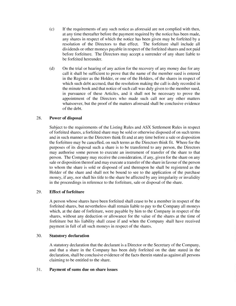 (c) If the requirements of any such notice as aforesaid are not complied with then, at any time thereafter before the payment required by the notice has been made, any shares in respect of which the notice has been given may be forfeited by a resolution of the Directors to that effect. The forfeiture shall include all dividends or other moneys payable in respect of the forfeited shares and not paid before forfeiture. The Directors may accept a surrender of any share liable to be forfeited hereunder. (d) On the trial or hearing of any action for the recovery of any money due for any call it shall be sufficient to prove that the name of the member sued is entered in the Register as the Holder, or one of the Holders, of the shares in respect of which such debt accrued, that the resolution making the call is duly recorded in the minute book and that notice of such call was duly given to the member sued, in pursuance of these Articles, and it shall not be necessary to prove the appointment of the Directors who made such call nor any other matters whatsoever, but the proof of the matters aforesaid shall be conclusive evidence of the debt. 28. Power of disposal Subject to the requirements of the Listing Rules and ASX Settlement Rules in respect of forfeited shares, a forfeited share may be sold or otherwise disposed of on such terms and in such manner as the Directors think fit and at any time before a sale or disposition the forfeiture may be cancelled, on such terms as the Directors think fit. Where for the purposes of its disposal such a share is to be transferred to any person, the Directors may authorise some person to execute an instrument of transfer of the share to that person. The Company may receive the consideration, if any, given for the share on any sale or disposition thereof and may execute a transfer of the share in favour of the person to whom the share is sold or disposed of and thereupon he shall be registered as the Holder of the share and shall not be bound to see to the application of the purchase money, if any, nor shall his title to the share be affected by any irregularity or invalidity in the proceedings in reference to the forfeiture, sale or disposal of the share. 29. Effect of forfeiture A person whose shares have been forfeited shall cease to be a member in respect of the forfeited shares, but nevertheless shall remain liable to pay to the Company all moneys which, at the date of forfeiture, were payable by him to the Company in respect of the shares, without any deduction or allowance for the value of the shares at the time of forfeiture but his liability shall cease if and when the Company shall have received payment in full of all such moneys in respect of the shares. 30. Statutory declaration A statutory declaration that the declarant is a Director or the Secretary of the Company, and that a share in the Company has been duly forfeited on the date stated in the declaration, shall be conclusive evidence of the facts therein stated as against all persons claiming to be entitled to the share. 31. Payment of sums due on share issues