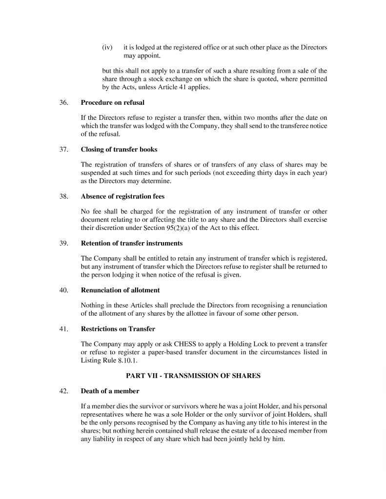 (iv) it is lodged at the registered office or at such other place as the Directors may appoint. but this shall not apply to a transfer of such a share resulting from a sale of the share through a stock exchange on which the share is quoted, where permitted by the Acts, unless Article 41 applies. 36. Procedure on refusal If the Directors refuse to register a transfer then, within two months after the date on which the transfer was lodged with the Company, they shall send to the transferee notice of the refusal. 37. Closing of transfer books The registration of transfers of shares or of transfers of any class of shares may be suspended at such times and for such periods (not exceeding thirty days in each year) as the Directors may determine. 38. Absence of registration fees No fee shall be charged for the registration of any instrument of transfer or other document relating to or affecting the title to any share and the Directors shall exercise their discretion under Section 95(2)(a) of the Act to this effect. 39. Retention of transfer instruments The Company shall be entitled to retain any instrument of transfer which is registered, but any instrument of transfer which the Directors refuse to register shall be returned to the person lodging it when notice of the refusal is given. 40. Renunciation of allotment Nothing in these Articles shall preclude the Directors from recognising a renunciation of the allotment of any shares by the allottee in favour of some other person. 41. Restrictions on Transfer The Company may apply or ask CHESS to apply a Holding Lock to prevent a transfer or refuse to register a paper-based transfer document in the circumstances listed in Listing Rule 8.10.1. PART VII - TRANSMISSION OF SHARES 42. Death of a member If a member dies the survivor or survivors where he was a joint Holder, and his personal representatives where he was a sole Holder or the only survivor of joint Holders, shall be the only persons recognised by the Company as having any title to his interest in the shares; but nothing herein contained shall release the estate of a deceased member from any liability in respect of any share which had been jointly held by him.