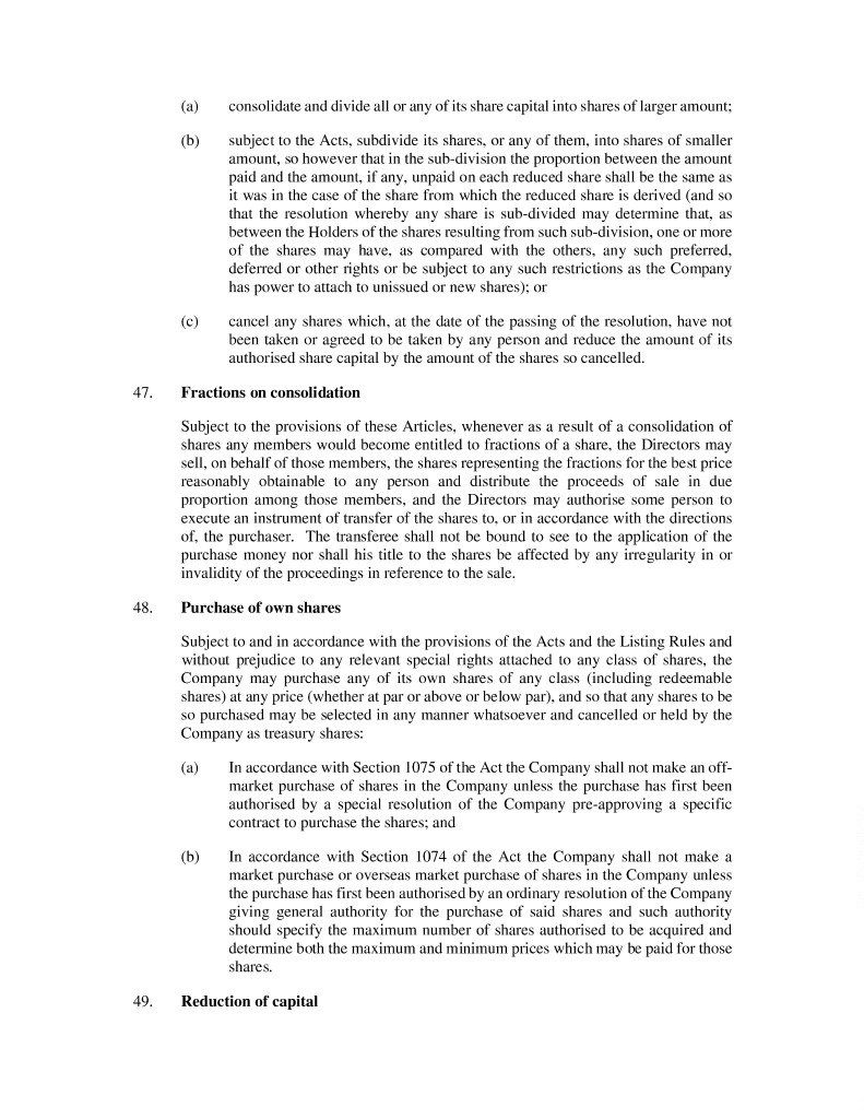 (a) consolidate and divide all or any of its share capital into shares of larger amount; (b) subject to the Acts, subdivide its shares, or any of them, into shares of smaller amount, so however that in the sub-division the proportion between the amount paid and the amount, if any, unpaid on each reduced share shall be the same as it was in the case of the share from which the reduced share is derived (and so that the resolution whereby any share is sub-divided may determine that, as between the Holders of the shares resulting from such sub-division, one or more of the shares may have, as compared with the others, any such preferred, deferred or other rights or be subject to any such restrictions as the Company has power to attach to unissued or new shares); or (c) cancel any shares which, at the date of the passing of the resolution, have not been taken or agreed to be taken by any person and reduce the amount of its authorised share capital by the amount of the shares so cancelled. 47. Fractions on consolidation Subject to the provisions of these Articles, whenever as a result of a consolidation of shares any members would become entitled to fractions of a share, the Directors may sell, on behalf of those members, the shares representing the fractions for the best price reasonably obtainable to any person and distribute the proceeds of sale in due proportion among those members, and the Directors may authorise some person to execute an instrument of transfer of the shares to, or in accordance with the directions of, the purchaser. The transferee shall not be bound to see to the application of the purchase money nor shall his title to the shares be affected by any irregularity in or invalidity of the proceedings in reference to the sale. 48. Purchase of own shares Subject to and in accordance with the provisions of the Acts and the Listing Rules and without prejudice to any relevant special rights attached to any class of shares, the Company may purchase any of its own shares of any class (including redeemable shares) at any price (whether at par or above or below par), and so that any shares to be so purchased may be selected in any manner whatsoever and cancelled or held by the Company as treasury shares: (a) In accordance with Section 1075 of the Act the Company shall not make an off- market purchase of shares in the Company unless the purchase has first been authorised by a special resolution of the Company pre-approving a specific contract to purchase the shares; and (b) In accordance with Section 1074 of the Act the Company shall not make a market purchase or overseas market purchase of shares in the Company unless the purchase has first been authorised by an ordinary resolution of the Company giving general authority for the purchase of said shares and such authority should specify the maximum number of shares authorised to be acquired and determine both the maximum and minimum prices which may be paid for those shares. 49. Reduction of capital