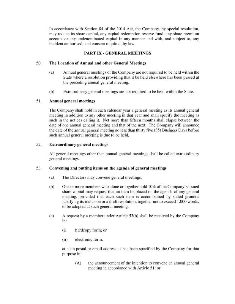 In accordance with Section 84 of the 2014 Act, the Company, by special resolution, may reduce its share capital, any capital redemption reserve fund, any share premium account or any undenominated capital in any manner and with, and subject to, any incident authorised, and consent required, by law. PART IX - GENERAL MEETINGS 50. The Location of Annual and other General Meetings (a) Annual general meetings of the Company are not required to be held within the State where a resolution providing that it be held elsewhere has been passed at the preceding annual general meeting. (b) Extraordinary general meetings are not required to be held within the State. 51. Annual general meetings The Company shall hold in each calendar year a general meeting as its annual general meeting in addition to any other meeting in that year and shall specify the meeting as such in the notices calling it. Not more than fifteen months shall elapse between the date of one annual general meeting and that of the next. The Company will announce the date of the annual general meeting no less than thirty five (35) Business Days before such annual general meeting is due to be held. 52. Extraordinary general meetings All general meetings other than annual general meetings shall be called extraordinary general meetings. 53. Convening and putting items on the agenda of general meetings (a) The Directors may convene general meetings. (b) One or more members who alone or together hold 10% of the Company’s issued share capital may request that an item be placed on the agenda of any general meeting, provided that each such item is accompanied by stated grounds justifying its inclusion or a draft resolution, together not to exceed 1,000 words, to be adopted at such general meeting. (c) A request by a member under Article 53(b) shall be received by the Company in: (i) hardcopy form; or (ii) electronic form, at such postal or email address as has been specified by the Company for that purpose in: (A) the announcement of the intention to convene an annual general meeting in accordance with Article 51; or