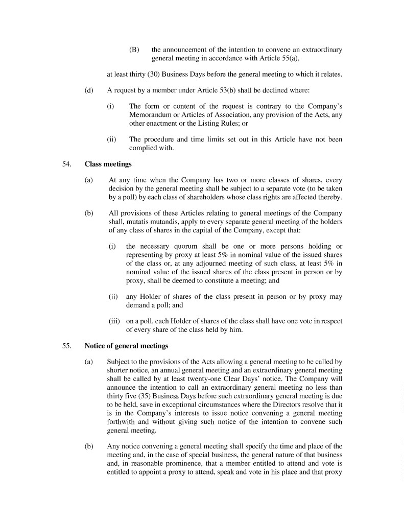 (B) the announcement of the intention to convene an extraordinary general meeting in accordance with Article 55(a), at least thirty (30) Business Days before the general meeting to which it relates. (d) A request by a member under Article 53(b) shall be declined where: (i) The form or content of the request is contrary to the Company’s Memorandum or Articles of Association, any provision of the Acts, any other enactment or the Listing Rules; or (ii) The procedure and time limits set out in this Article have not been complied with. 54. Class meetings (a) At any time when the Company has two or more classes of shares, every decision by the general meeting shall be subject to a separate vote (to be taken by a poll) by each class of shareholders whose class rights are affected thereby. (b) All provisions of these Articles relating to general meetings of the Company shall, mutatis mutandis, apply to every separate general meeting of the holders of any class of shares in the capital of the Company, except that: (i) the necessary quorum shall be one or more persons holding or representing by proxy at least 5% in nominal value of the issued shares of the class or, at any adjourned meeting of such class, at least 5% in nominal value of the issued shares of the class present in person or by proxy, shall be deemed to constitute a meeting; and (ii) any Holder of shares of the class present in person or by proxy may demand a poll; and (iii) on a poll, each Holder of shares of the class shall have one vote in respect of every share of the class held by him. 55. Notice of general meetings (a) Subject to the provisions of the Acts allowing a general meeting to be called by shorter notice, an annual general meeting and an extraordinary general meeting shall be called by at least twenty-one Clear Days’ notice. The Company will announce the intention to call an extraordinary general meeting no less than thirty five (35) Business Days before such extraordinary general meeting is due to be held, save in exceptional circumstances where the Directors resolve that it is in the Company’s interests to issue notice convening a general meeting forthwith and without giving such notice of the intention to convene such general meeting. (b) Any notice convening a general meeting shall specify the time and place of the meeting and, in the case of special business, the general nature of that business and, in reasonable prominence, that a member entitled to attend and vote is entitled to appoint a proxy to attend, speak and vote in his place and that proxy