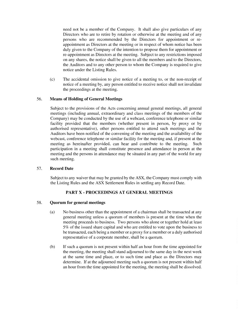 need not be a member of the Company. It shall also give particulars of any Directors who are to retire by rotation or otherwise at the meeting and of any persons who are recommended by the Directors for appointment or re- appointment as Directors at the meeting or in respect of whom notice has been duly given to the Company of the intention to propose them for appointment or re-appointment as Directors at the meeting. Subject to any restrictions imposed on any shares, the notice shall be given to all the members and to the Directors, the Auditors and to any other person to whom the Company is required to give notice under the Listing Rules. (c) The accidental omission to give notice of a meeting to, or the non-receipt of notice of a meeting by, any person entitled to receive notice shall not invalidate the proceedings at the meeting. 56. Means of Holding of General Meetings Subject to the provisions of the Acts concerning annual general meetings, all general meetings (including annual, extraordinary and class meetings of the members of the Company) may be conducted by the use of a webcast, conference telephone or similar facility provided that the members (whether present in person, by proxy or by authorised representative), other persons entitled to attend such meetings and the Auditors have been notified of the convening of the meeting and the availability of the webcast, conference telephone or similar facility for the meeting and, if present at the meeting as hereinafter provided, can hear and contribute to the meeting. Such participation in a meeting shall constitute presence and attendance in person at the meeting and the persons in attendance may be situated in any part of the world for any such meeting. 57. Record Date Subject to any waiver that may be granted by the ASX, the Company must comply with the Listing Rules and the ASX Settlement Rules in settling any Record Date. PART X - PROCEEDINGS AT GENERAL MEETINGS 58. Quorum for general meetings (a) No business other than the appointment of a chairman shall be transacted at any general meeting unless a quorum of members is present at the time when the meeting proceeds to business. Two persons who alone or together hold at least 5% of the issued share capital and who are entitled to vote upon the business to be transacted, each being a member or a proxy for a member or a duly authorised representative of a corporate member, shall be a quorum. (b) If such a quorum is not present within half an hour from the time appointed for the meeting, the meeting shall stand adjourned to the same day in the next week at the same time and place, or to such time and place as the Directors may determine. If at the adjourned meeting such a quorum is not present within half an hour from the time appointed for the meeting, the meeting shall be dissolved.