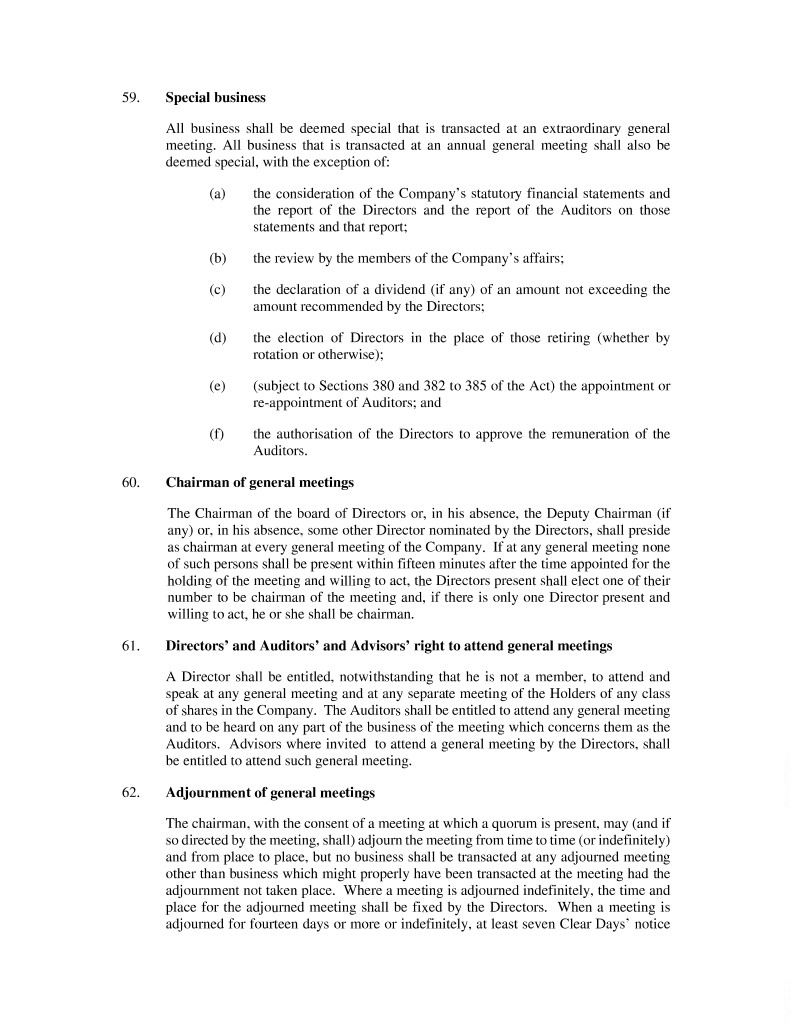 59. Special business All business shall be deemed special that is transacted at an extraordinary general meeting. All business that is transacted at an annual general meeting shall also be deemed special, with the exception of: (a) the consideration of the Company’s statutory financial statements and the report of the Directors and the report of the Auditors on those statements and that report; (b) the review by the members of the Company’s affairs; (c) the declaration of a dividend (if any) of an amount not exceeding the amount recommended by the Directors; (d) the election of Directors in the place of those retiring (whether by rotation or otherwise); (e) (subject to Sections 380 and 382 to 385 of the Act) the appointment or re-appointment of Auditors; and (f) the authorisation of the Directors to approve the remuneration of the Auditors. 60. Chairman of general meetings The Chairman of the board of Directors or, in his absence, the Deputy Chairman (if any) or, in his absence, some other Director nominated by the Directors, shall preside as chairman at every general meeting of the Company. If at any general meeting none of such persons shall be present within fifteen minutes after the time appointed for the holding of the meeting and willing to act, the Directors present shall elect one of their number to be chairman of the meeting and, if there is only one Director present and willing to act, he or she shall be chairman. 61. Directors’ and Auditors’ and Advisors’ right to attend general meetings A Director shall be entitled, notwithstanding that he is not a member, to attend and speak at any general meeting and at any separate meeting of the Holders of any class of shares in the Company. The Auditors shall be entitled to attend any general meeting and to be heard on any part of the business of the meeting which concerns them as the Auditors. Advisors where invited to attend a general meeting by the Directors, shall be entitled to attend such general meeting. 62. Adjournment of general meetings The chairman, with the consent of a meeting at which a quorum is present, may (and if so directed by the meeting, shall) adjourn the meeting from time to time (or indefinitely) and from place to place, but no business shall be transacted at any adjourned meeting other than business which might properly have been transacted at the meeting had the adjournment not taken place. Where a meeting is adjourned indefinitely, the time and place for the adjourned meeting shall be fixed by the Directors. When a meeting is adjourned for fourteen days or more or indefinitely, at least seven Clear Days’ notice
