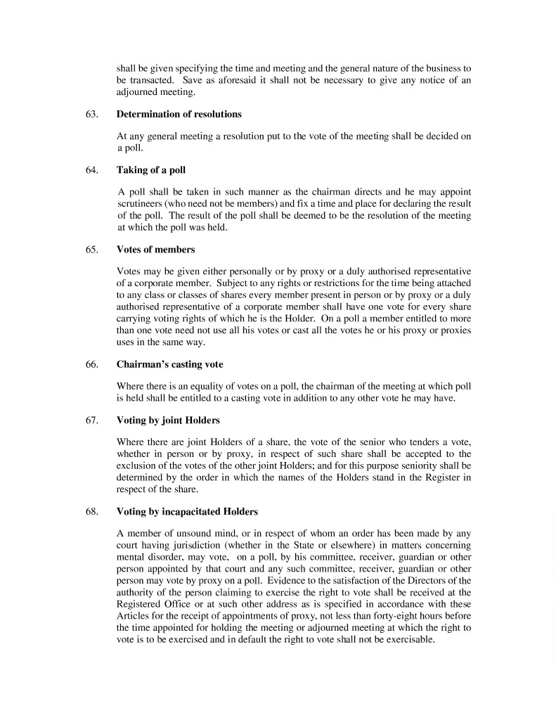 shall be given specifying the time and meeting and the general nature of the business to be transacted. Save as aforesaid it shall not be necessary to give any notice of an adjourned meeting. 63. Determination of resolutions At any general meeting a resolution put to the vote of the meeting shall be decided on a poll. 64. Taking of a poll A poll shall be taken in such manner as the chairman directs and he may appoint scrutineers (who need not be members) and fix a time and place for declaring the result of the poll. The result of the poll shall be deemed to be the resolution of the meeting at which the poll was held. 65. Votes of members Votes may be given either personally or by proxy or a duly authorised representative of a corporate member. Subject to any rights or restrictions for the time being attached to any class or classes of shares every member present in person or by proxy or a duly authorised representative of a corporate member shall have one vote for every share carrying voting rights of which he is the Holder. On a poll a member entitled to more than one vote need not use all his votes or cast all the votes he or his proxy or proxies uses in the same way. 66. Chairman’s casting vote Where there is an equality of votes on a poll, the chairman of the meeting at which poll is held shall be entitled to a casting vote in addition to any other vote he may have. 67. Voting by joint Holders Where there are joint Holders of a share, the vote of the senior who tenders a vote, whether in person or by proxy, in respect of such share shall be accepted to the exclusion of the votes of the other joint Holders; and for this purpose seniority shall be determined by the order in which the names of the Holders stand in the Register in respect of the share. 68. Voting by incapacitated Holders A member of unsound mind, or in respect of whom an order has been made by any court having jurisdiction (whether in the State or elsewhere) in matters concerning mental disorder, may vote, on a poll, by his committee, receiver, guardian or other person appointed by that court and any such committee, receiver, guardian or other person may vote by proxy on a poll. Evidence to the satisfaction of the Directors of the authority of the person claiming to exercise the right to vote shall be received at the Registered Office or at such other address as is specified in accordance with these Articles for the receipt of appointments of proxy, not less than forty-eight hours before the time appointed for holding the meeting or adjourned meeting at which the right to vote is to be exercised and in default the right to vote shall not be exercisable.