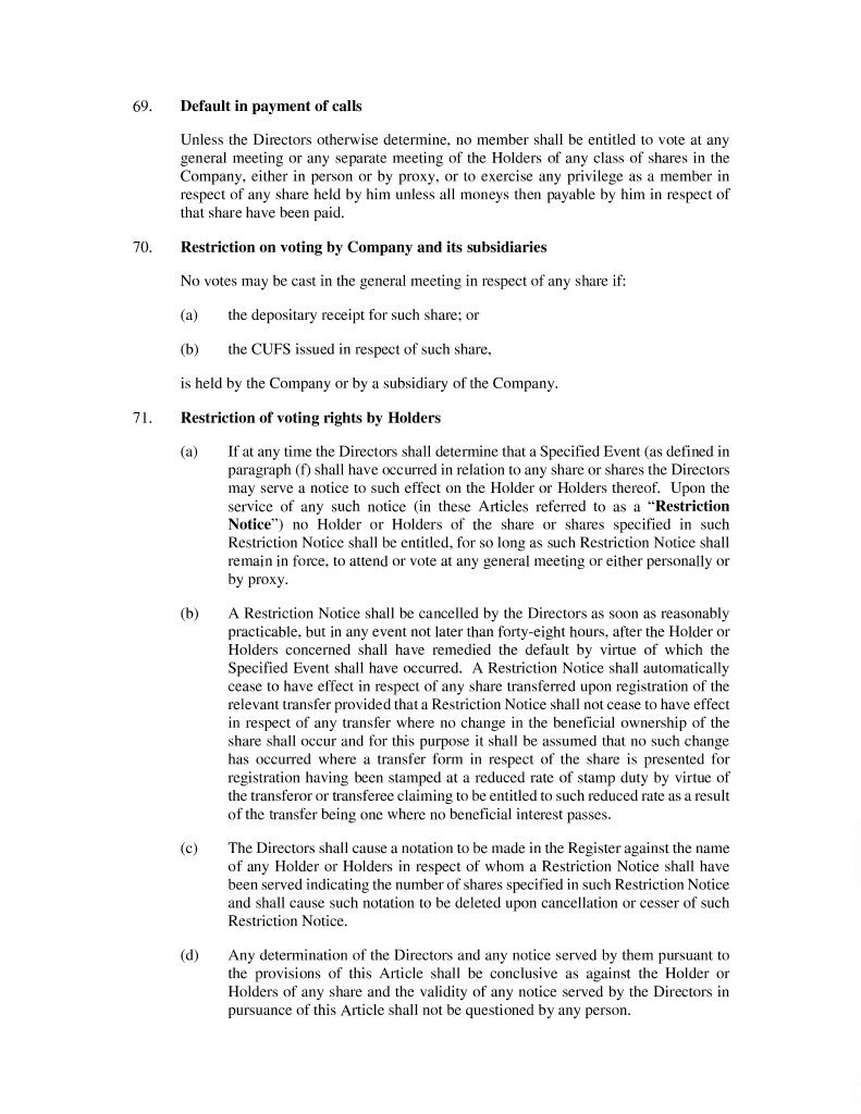 69. Default in payment of calls Unless the Directors otherwise determine, no member shall be entitled to vote at any general meeting or any separate meeting of the Holders of any class of shares in the Company, either in person or by proxy, or to exercise any privilege as a member in respect of any share held by him unless all moneys then payable by him in respect of that share have been paid. 70. Restriction on voting by Company and its subsidiaries No votes may be cast in the general meeting in respect of any share if: (a) the depositary receipt for such share; or (b) the CUFS issued in respect of such share, is held by the Company or by a subsidiary of the Company. 71. Restriction of voting rights by Holders (a) If at any time the Directors shall determine that a Specified Event (as defined in paragraph (f) shall have occurred in relation to any share or shares the Directors may serve a notice to such effect on the Holder or Holders thereof. Upon the service of any such notice (in these Articles referred to as a “ Restriction Notice ”) no Holder or Holders of the share or shares specified in such Restriction Notice shall be entitled, for so long as such Restriction Notice shall remain in force, to attend or vote at any general meeting or either personally or by proxy. (b) A Restriction Notice shall be cancelled by the Directors as soon as reasonably practicable, but in any event not later than forty-eight hours, after the Holder or Holders concerned shall have remedied the default by virtue of which the Specified Event shall have occurred. A Restriction Notice shall automatically cease to have effect in respect of any share transferred upon registration of the relevant transfer provided that a Restriction Notice shall not cease to have effect in respect of any transfer where no change in the beneficial ownership of the share shall occur and for this purpose it shall be assumed that no such change has occurred where a transfer form in respect of the share is presented for registration having been stamped at a reduced rate of stamp duty by virtue of the transferor or transferee claiming to be entitled to such reduced rate as a result of the transfer being one where no beneficial interest passes. (c) The Directors shall cause a notation to be made in the Register against the name of any Holder or Holders in respect of whom a Restriction Notice shall have been served indicating the number of shares specified in such Restriction Notice and shall cause such notation to be deleted upon cancellation or cesser of such Restriction Notice. (d) Any determination of the Directors and any notice served by them pursuant to the provisions of this Article shall be conclusive as against the Holder or Holders of any share and the validity of any notice served by the Directors in pursuance of this Article shall not be questioned by any person.