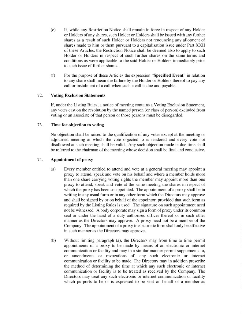 (e) If, while any Restriction Notice shall remain in force in respect of any Holder or Holders of any shares, such Holder or Holders shall be issued with any further shares as a result of such Holder or Holders not renouncing any allotment of shares made to him or them pursuant to a capitalisation issue under Part XXII of these Articles, the Restriction Notice shall be deemed also to apply to such Holder or Holders in respect of such further shares on the same terms and conditions as were applicable to the said Holder or Holders immediately prior to such issue of further shares. (f) For the purpose of these Articles the expression “ Specified Event ” in relation to any share shall mean the failure by the Holder or Holders thereof to pay any call or instalment of a call when such a call is due and payable. 72. Voting Exclusion Statements If, under the Listing Rules, a notice of meeting contains a Voting Exclusion Statement, any votes cast on the resolution by the named person (or class of person) excluded from voting or an associate of that person or those persons must be disregarded. 73. Time for objection to voting No objection shall be raised to the qualification of any voter except at the meeting or adjourned meeting at which the vote objected to is tendered and every vote not disallowed at such meeting shall be valid. Any such objection made in due time shall be referred to the chairman of the meeting whose decision shall be final and conclusive. 74. Appointment of proxy (a) Every member entitled to attend and vote at a general meeting may appoint a proxy to attend, speak and vote on his behalf and where a member holds more than one share carrying voting rights the member may appoint more than one proxy to attend, speak and vote at the same meeting the shares in respect of which the proxy has been so appointed. The appointment of a proxy shall be in writing in any usual form or in any other form which the Directors may approve and shall be signed by or on behalf of the appointor, provided that such form as required by the Listing Rules is used. The signature on such appointment need not be witnessed. A body corporate may sign a form of proxy under its common seal or under the hand of a duly authorised officer thereof or in such other manner as the Directors may approve. A proxy need not be a member of the Company. The appointment of a proxy in electronic form shall only be effective in such manner as the Directors may approve. (b) Without limiting paragraph (a), the Directors may from time to time permit appointments of a proxy to be made by means of an electronic or internet communication or facility and may in a similar manner permit supplements to, or amendments or revocations of, any such electronic or internet communication or facility to be made. The Directors may in addition prescribe the method of determining the time at which any such electronic or internet communication or facility is to be treated as received by the Company. The Directors may treat any such electronic or internet communication or facility which purports to be or is expressed to be sent on behalf of a member as