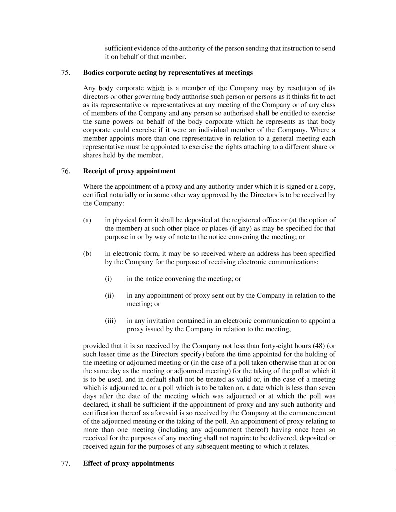 sufficient evidence of the authority of the person sending that instruction to send it on behalf of that member. 75. Bodies corporate acting by representatives at meetings Any body corporate which is a member of the Company may by resolution of its directors or other governing body authorise such person or persons as it thinks fit to act as its representative or representatives at any meeting of the Company or of any class of members of the Company and any person so authorised shall be entitled to exercise the same powers on behalf of the body corporate which he represents as that body corporate could exercise if it were an individual member of the Company. Where a member appoints more than one representative in relation to a general meeting each representative must be appointed to exercise the rights attaching to a different share or shares held by the member. 76. Receipt of proxy appointment Where the appointment of a proxy and any authority under which it is signed or a copy, certified notarially or in some other way approved by the Directors is to be received by the Company: (a) in physical form it shall be deposited at the registered office or (at the option of the member) at such other place or places (if any) as may be specified for that purpose in or by way of note to the notice convening the meeting; or (b) in electronic form, it may be so received where an address has been specified by the Company for the purpose of receiving electronic communications: (i) in the notice convening the meeting; or (ii) in any appointment of proxy sent out by the Company in relation to the meeting; or (iii) in any invitation contained in an electronic communication to appoint a proxy issued by the Company in relation to the meeting, provided that it is so received by the Company not less than forty-eight hours (48) (or such lesser time as the Directors specify) before the time appointed for the holding of the meeting or adjourned meeting or (in the case of a poll taken otherwise than at or on the same day as the meeting or adjourned meeting) for the taking of the poll at which it is to be used, and in default shall not be treated as valid or, in the case of a meeting which is adjourned to, or a poll which is to be taken on, a date which is less than seven days after the date of the meeting which was adjourned or at which the poll was declared, it shall be sufficient if the appointment of proxy and any such authority and certification thereof as aforesaid is so received by the Company at the commencement of the adjourned meeting or the taking of the poll. An appointment of proxy relating to more than one meeting (including any adjournment thereof) having once been so received for the purposes of any meeting shall not require to be delivered, deposited or received again for the purposes of any subsequent meeting to which it relates. 77. Effect of proxy appointments