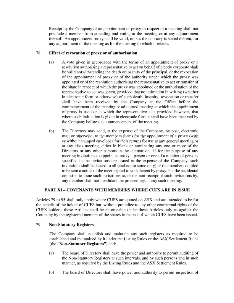 Receipt by the Company of an appointment of proxy in respect of a meeting shall not preclude a member from attending and voting at the meeting or at any adjournment thereof. An appointment proxy shall be valid, unless the contrary is stated therein, for any adjournment of the meeting as for the meeting to which it relates. 78. Effect of revocation of proxy or of authorisation (a) A vote given in accordance with the terms of an appointment of proxy or a resolution authorising a representative to act on behalf of a body corporate shall be valid notwithstanding the death or insanity of the principal, or the revocation of the appointment of proxy or of the authority under which the proxy was appointed or of the resolution authorising the representative to act or transfer of the share in respect of which the proxy was appointed or the authorisation of the representative to act was given, provided that no intimation in writing (whether in electronic form or otherwise) of such death, insanity, revocation or transfer shall have been received by the Company at the Office before the commencement of the meeting or adjourned meeting at which the appointment of proxy is used or at which the representative acts provided however, that where such intimation is given in electronic form it shall have been received by the Company before the commencement of the meeting. (b) The Directors may send, at the expense of the Company, by post, electronic mail or otherwise, to the members forms for the appointment of a proxy (with or without stamped envelopes for their return) for use at any general meeting or at any class meeting, either in blank or nominating any one or more of the Directors or any other persons in the alternative. If for the purpose of any meeting invitations to appoint as proxy a person or one of a number of persons specified in the invitations are issued at the expense of the Company, such invitations shall be issued to all (and not to some only) of the members entitled to be sent a notice of the meeting and to vote thereat by proxy, but the accidental omission to issue such invitations to, or the non-receipt of such invitations by, any member shall not invalidate the proceedings at any such meeting. PART XI – COVENANTS WITH MEMBERS WHERE CUFS ARE IN ISSUE Articles 79 to 95 shall only apply where CUFS are quoted on ASX and are intended to be for the benefit of the holder of CUFS but, without prejudice to any other contractual rights of the CUFS holders, these Articles shall be enforceable under these Articles only as against the Company by the registered member of the shares in respect of which CUFS have been issued. 79. Non-Statutory Registers The Company shall establish and maintain any such registers as required to be established and maintained by it under the Listing Rules or the ASX Settlement Rules (the “ Non-Statutory Registers”) and: (a) The board of Directors shall have the power and authority to permit auditing of the Non-Statutory Registers at such intervals, and by such persons and in such manner, as required by the Listing Rules and the ASX Settlement Rules. (b) The board of Directors shall have power and authority to permit inspection of