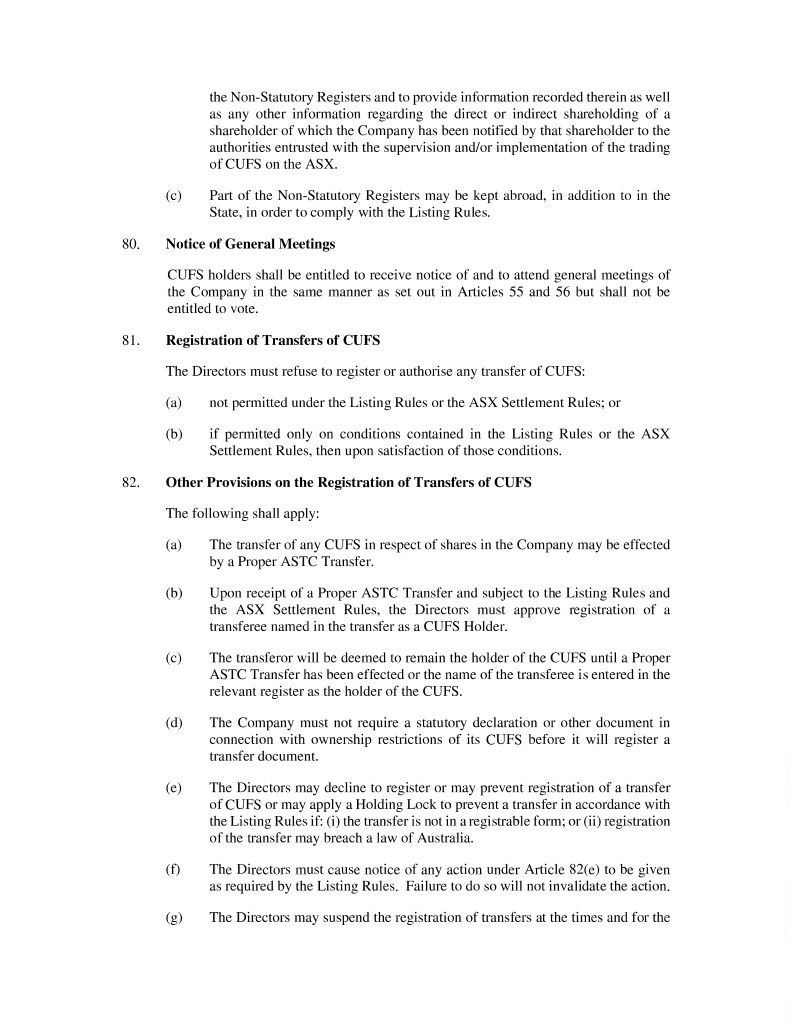 the Non-Statutory Registers and to provide information recorded therein as well as any other information regarding the direct or indirect shareholding of a shareholder of which the Company has been notified by that shareholder to the authorities entrusted with the supervision and/or implementation of the trading of CUFS on the ASX. (c) Part of the Non-Statutory Registers may be kept abroad, in addition to in the State, in order to comply with the Listing Rules. 80. Notice of General Meetings CUFS holders shall be entitled to receive notice of and to attend general meetings of the Company in the same manner as set out in Articles 55 and 56 but shall not be entitled to vote. 81. Registration of Transfers of CUFS The Directors must refuse to register or authorise any transfer of CUFS: (a) not permitted under the Listing Rules or the ASX Settlement Rules; or (b) if permitted only on conditions contained in the Listing Rules or the ASX Settlement Rules, then upon satisfaction of those conditions. 82. Other Provisions on the Registration of Transfers of CUFS The following shall apply: (a) The transfer of any CUFS in respect of shares in the Company may be effected by a Proper ASTC Transfer. (b) Upon receipt of a Proper ASTC Transfer and subject to the Listing Rules and the ASX Settlement Rules, the Directors must approve registration of a transferee named in the transfer as a CUFS Holder. (c) The transferor will be deemed to remain the holder of the CUFS until a Proper ASTC Transfer has been effected or the name of the transferee is entered in the relevant register as the holder of the CUFS. (d) The Company must not require a statutory declaration or other document in connection with ownership restrictions of its CUFS before it will register a transfer document. (e) The Directors may decline to register or may prevent registration of a transfer of CUFS or may apply a Holding Lock to prevent a transfer in accordance with the Listing Rules if: (i) the transfer is not in a registrable form; or (ii) registration of the transfer may breach a law of Australia. (f) The Directors must cause notice of any action under Article 82(e) to be given as required by the Listing Rules. Failure to do so will not invalidate the action. (g) The Directors may suspend the registration of transfers at the times and for the