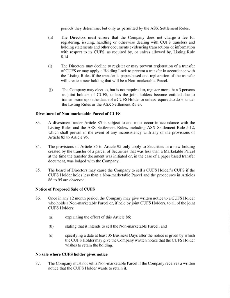 periods they determine, but only as permitted by the ASX Settlement Rules. (h) The Directors must ensure that the Company does not charge a fee for registering, issuing, handling or otherwise dealing with CUFS transfers and holding statements and other documents evidencing transactions or information with respect to its CUFS, as required by, or unless allowed by, Listing Rule 8.14. (i) The Directors may decline to register or may prevent registration of a transfer of CUFS or may apply a Holding Lock to prevent a transfer in accordance with the Listing Rules if the transfer is paper-based and registration of the transfer will create a new holding that will be a Non-marketable Parcel. (j) The Company may elect to, but is not required to, register more than 3 persons as joint holders of CUFS, unless the joint holders become entitled due to transmission upon the death of a CUFS Holder or unless required to do so under the Listing Rules or the ASX Settlement Rules. Divestment of Non-marketable Parcel of CUFS 83. A divestment under Article 85 is subject to and must occur in accordance with the Listing Rules and the ASX Settlement Rules, including ASX Settlement Rule 5.12, which shall prevail in the event of any inconsistency with any of the provisions of Article 85 to Article 95. 84. The provisions of Article 85 to Article 95 only apply to Securities in a new holding created by the transfer of a parcel of Securities that was less than a Marketable Parcel at the time the transfer document was initiated or, in the case of a paper based transfer document, was lodged with the Company. 85. The board of Directors may cause the Company to sell a CUFS Holder’s CUFS if the CUFS Holder holds less than a Non-marketable Parcel and the procedures in Articles 86 to 95 are observed. Notice of Proposed Sale of CUFS 86. Once in any 12 month period, the Company may give written notice to a CUFS Holder who holds a Non-marketable Parcel or, if held by joint CUFS Holders, to all of the joint CUFS Holders: (a) explaining the effect of this Article 86; (b) stating that it intends to sell the Non-marketable Parcel; and (c) specifying a date at least 35 Business Days after the notice is given by which the CUFS Holder may give the Company written notice that the CUFS Holder wishes to retain the holding. No sale where CUFS holder gives notice 87. The Company must not sell a Non-marketable Parcel if the Company receives a written notice that the CUFS Holder wants to retain it.