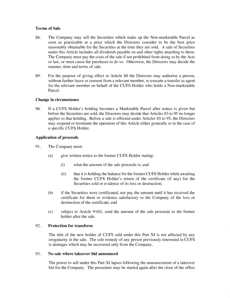 Terms of Sale 88. The Company may sell the Securities which make up the Non-marketable Parcel as soon as practicable at a price which the Directors consider to be the best price reasonably obtainable for the Securities at the time they are sold. A sale of Securities under this Article includes all dividends payable on and other rights attaching to them. The Company must pay the costs of the sale if not prohibited from doing so by the Acts or law, or must cause the purchaser to do so. Otherwise, the Directors may decide the manner, time and terms of sale. 89. For the purpose of giving effect to Article 88 the Directors may authorise a person, without further leave or consent from a relevant member, to execute a transfer as agent for the relevant member on behalf of the CUFS Holder who holds a Non-marketable Parcel. Change in circumstance 90. If a CUFS Holder’s holding becomes a Marketable Parcel after notice is given but before the Securities are sold, the Directors may decide that Articles 83 to 95 no longer applies to that holding. Before a sale is effected under Articles 85 to 95, the Directors may suspend or terminate the operation of this Article either generally or in the case of a specific CUFS Holder. Application of proceeds 91. The Company must: (a) give written notice to the former CUFS Holder stating: (i) what the amount of the sale proceeds is; and (ii) that it is holding the balance for the former CUFS Holder while awaiting the former CUFS Holder’s return of the certificate (if any) for the Securities sold or evidence of its loss or destruction; (b) if the Securities were certificated, not pay the amount until it has received the certificate for them or evidence satisfactory to the Company of the loss or destruction of the certificate; and (c) subject to Article 91(b), send the amount of the sale proceeds to the former holder after the sale. 92. Protection for transferee The title of the new holder of CUFS sold under this Part XI is not affected by any irregularity in the sale. The sole remedy of any person previously interested in CUFS is damages which may be recovered only from the Company. 93. No sale where takeover bid announced The power to sell under this Part XI lapses following the announcement of a takeover bid for the Company. The procedure may be started again after the close of the offers