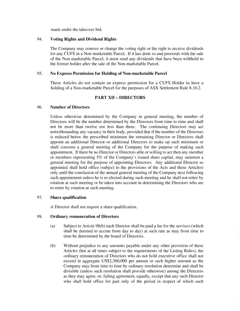 made under the takeover bid. 94. Voting Rights and Dividend Rights The Company may remove or change the voting right or the right to receive dividends for any CUFS in a Non-marketable Parcel. If it has done so and proceeds with the sale of the Non-marketable Parcel, it must send any dividends that have been withheld to the former holder after the sale of the Non-marketable Parcel. 95. No Express Permission for Holding of Non-marketable Parcel These Articles do not contain an express permission for a CUFS Holder to have a holding of a Non-marketable Parcel for the purposes of ASX Settlement Rule 8.10.2. PART XII – DIRECTORS 96. Number of Directors Unless otherwise determined by the Company in general meeting, the number of Directors will be the number determined by the Directors from time to time and shall not be more than twelve nor less than three. The continuing Directors may act notwithstanding any vacancy in their body, provided that if the number of the Directors is reduced below the prescribed minimum the remaining Director or Directors shall appoint an additional Director or additional Directors to make up such minimum or shall convene a general meeting of the Company for the purpose of making such appointment. If there be no Director or Directors able or willing to act then any member or members representing 5% of the Company’s issued share capital, may summon a general meeting for the purpose of appointing Directors. Any additional Director so appointed shall hold office (subject to the provisions of the Acts and these Articles) only until the conclusion of the annual general meeting of the Company next following such appointment unless he is re-elected during such meeting and he shall not retire by rotation at such meeting or be taken into account in determining the Directors who are to retire by rotation at such meeting. 97. Share qualification A Director shall not require a share qualification. 98. Ordinary remuneration of Directors (a) Subject to Article 98(b) each Director shall be paid a fee for the services (which shall be deemed to accrue from day to day) at such rate as may from time to time be determined by the board of Directors. (b) Without prejudice to any amounts payable under any other provision of these Articles (but at all times subject to the requirements of the Listing Rules), the ordinary remuneration of Directors who do not hold executive office shall not exceed in aggregate US$2,300,000 per annum or such higher amount as the Company may from time to time by ordinary resolution determine and shall be divisible (unless such resolution shall provide otherwise) among the Directors as they may agree, or, failing agreement, equally, except that any such Director who shall hold office for part only of the period in respect of which such