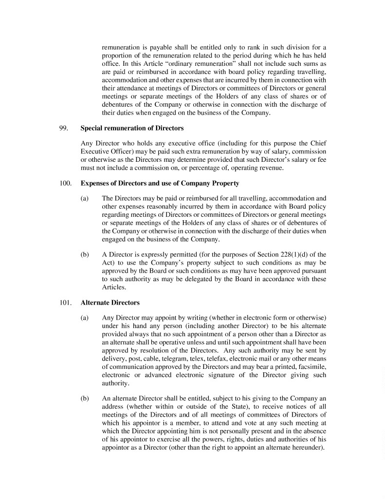 remuneration is payable shall be entitled only to rank in such division for a proportion of the remuneration related to the period during which he has held office. In this Article “ordinary remuneration” shall not include such sums as are paid or reimbursed in accordance with board policy regarding travelling, accommodation and other expenses that are incurred by them in connection with their attendance at meetings of Directors or committees of Directors or general meetings or separate meetings of the Holders of any class of shares or of debentures of the Company or otherwise in connection with the discharge of their duties when engaged on the business of the Company. 99. Special remuneration of Directors Any Director who holds any executive office (including for this purpose the Chief Executive Officer) may be paid such extra remuneration by way of salary, commission or otherwise as the Directors may determine provided that such Director’s salary or fee must not include a commission on, or percentage of, operating revenue. 100. Expenses of Directors and use of Company Property (a) The Directors may be paid or reimbursed for all travelling, accommodation and other expenses reasonably incurred by them in accordance with Board policy regarding meetings of Directors or committees of Directors or general meetings or separate meetings of the Holders of any class of shares or of debentures of the Company or otherwise in connection with the discharge of their duties when engaged on the business of the Company. (b) A Director is expressly permitted (for the purposes of Section 228(1)(d) of the Act) to use the Company’s property subject to such conditions as may be approved by the Board or such conditions as may have been approved pursuant to such authority as may be delegated by the Board in accordance with these Articles. 101. Alternate Directors (a) Any Director may appoint by writing (whether in electronic form or otherwise) under his hand any person (including another Director) to be his alternate provided always that no such appointment of a person other than a Director as an alternate shall be operative unless and until such appointment shall have been approved by resolution of the Directors. Any such authority may be sent by delivery, post, cable, telegram, telex, telefax, electronic mail or any other means of communication approved by the Directors and may bear a printed, facsimile, electronic or advanced electronic signature of the Director giving such authority. (b) An alternate Director shall be entitled, subject to his giving to the Company an address (whether within or outside of the State), to receive notices of all meetings of the Directors and of all meetings of committees of Directors of which his appointor is a member, to attend and vote at any such meeting at which the Director appointing him is not personally present and in the absence of his appointor to exercise all the powers, rights, duties and authorities of his appointor as a Director (other than the right to appoint an alternate hereunder).