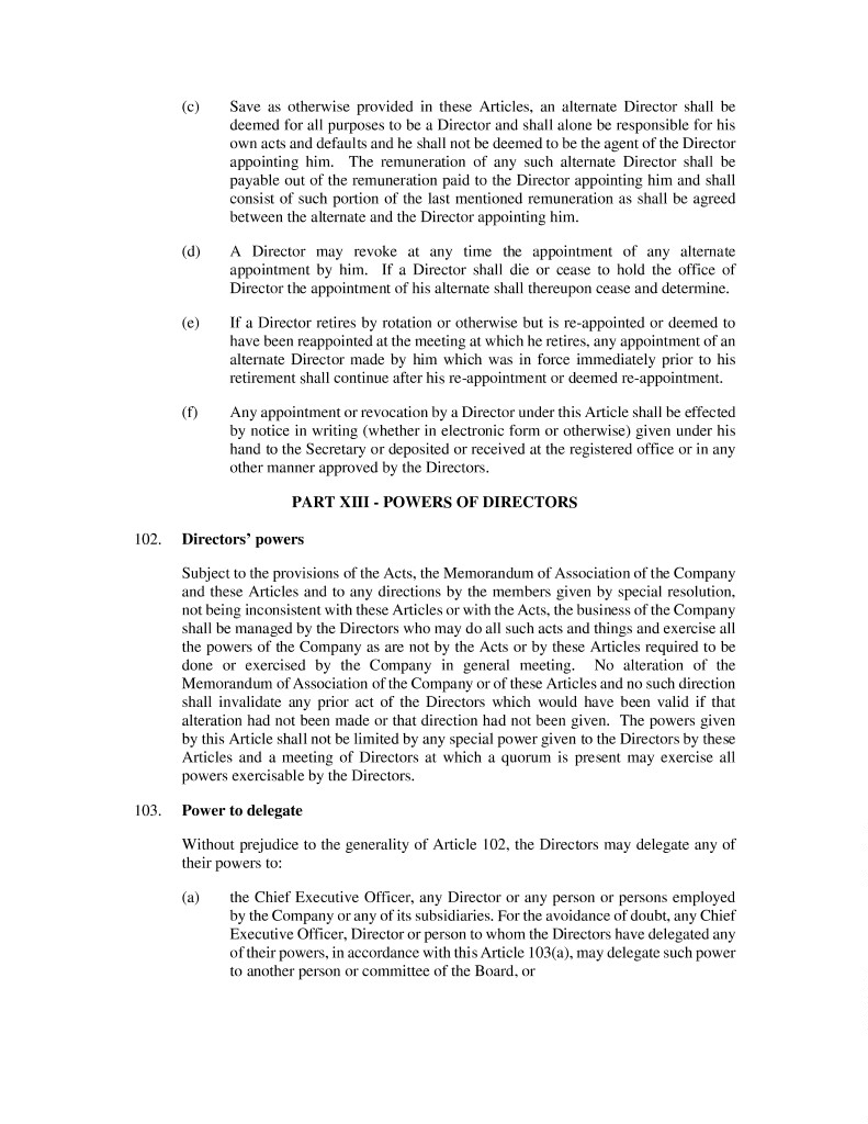 (c) Save as otherwise provided in these Articles, an alternate Director shall be deemed for all purposes to be a Director and shall alone be responsible for his own acts and defaults and he shall not be deemed to be the agent of the Director appointing him. The remuneration of any such alternate Director shall be payable out of the remuneration paid to the Director appointing him and shall consist of such portion of the last mentioned remuneration as shall be agreed between the alternate and the Director appointing him. (d) A Director may revoke at any time the appointment of any alternate appointment by him. If a Director shall die or cease to hold the office of Director the appointment of his alternate shall thereupon cease and determine. (e) If a Director retires by rotation or otherwise but is re-appointed or deemed to have been reappointed at the meeting at which he retires, any appointment of an alternate Director made by him which was in force immediately prior to his retirement shall continue after his re-appointment or deemed re-appointment. (f) Any appointment or revocation by a Director under this Article shall be effected by notice in writing (whether in electronic form or otherwise) given under his hand to the Secretary or deposited or received at the registered office or in any other manner approved by the Directors. PART XIII - POWERS OF DIRECTORS 102. Directors’ powers Subject to the provisions of the Acts, the Memorandum of Association of the Company and these Articles and to any directions by the members given by special resolution, not being inconsistent with these Articles or with the Acts, the business of the Company shall be managed by the Directors who may do all such acts and things and exercise all the powers of the Company as are not by the Acts or by these Articles required to be done or exercised by the Company in general meeting. No alteration of the Memorandum of Association of the Company or of these Articles and no such direction shall invalidate any prior act of the Directors which would have been valid if that alteration had not been made or that direction had not been given. The powers given by this Article shall not be limited by any special power given to the Directors by these Articles and a meeting of Directors at which a quorum is present may exercise all powers exercisable by the Directors. 103. Power to delegate Without prejudice to the generality of Article 102, the Directors may delegate any of their powers to: (a) the Chief Executive Officer, any Director or any person or persons employed by the Company or any of its subsidiaries. For the avoidance of doubt, any Chief Executive Officer, Director or person to whom the Directors have delegated any of their powers, in accordance with this Article 103(a), may delegate such power to another person or committee of the Board, or