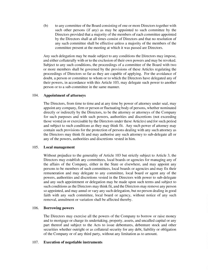 (b) to any committee of the Board consisting of one or more Directors together with such other persons (if any) as may be appointed to such committee by the Directors provided that a majority of the members of each committee appointed by the Directors shall at all times consist of Directors and that no resolution of any such committee shall be effective unless a majority of the members of the committee present at the meeting at which it was passed are Directors. Any such delegation may be made subject to any conditions the Directors may impose, and either collaterally with or to the exclusion of their own powers and may be revoked. Subject to any such conditions, the proceedings of a committee of the Board with two or more members shall be governed by the provisions of these Articles regulating the proceedings of Directors so far as they are capable of applying. For the avoidance of doubt, a person or committee to whom or to which the Directors have delegated any of their powers, in accordance with this Article 103, may delegate such power to another person or to a sub-committee in the same manner. 104. Appointment of attorneys The Directors, from time to time and at any time by power of attorney under seal, may appoint any company, firm or person or fluctuating body of persons, whether nominated directly or indirectly by the Directors, to be the attorney or attorneys of the Company for such purposes and with such powers, authorities and discretions (not exceeding those vested in or exercisable by the Directors under these Articles) and for such period and subject to such conditions as they may think fit. Any such power of attorney may contain such provisions for the protection of persons dealing with any such attorney as the Directors may think fit and may authorise any such attorney to sub-delegate all or any of the powers, authorities and discretions vested in him. 105. Local management Without prejudice to the generality of Article 103 but strictly subject to Article 3, the Directors may establish any committees, local boards or agencies for managing any of the affairs of the Company, either in the State or elsewhere, and may appoint any persons to be members of such committees, local boards or agencies and may fix their remuneration and may delegate to any committee, local board or agent any of the powers, authorities and discretions vested in the Directors with power to sub-delegate and any such appointment or delegation may be made upon such terms and subject to such conditions as the Directors may think fit, and the Directors may remove any person so appointed, and may annul or vary any such delegation, but no person dealing in good faith with any such committee, local board or agency, without notice of any such removal, annulment or variation shall be affected thereby. 106. Borrowing powers The Directors may exercise all the powers of the Company to borrow or raise money and to mortgage or charge its undertaking, property, assets, and uncalled capital or any part thereof and subject to the Acts to issue debentures, debenture stock and other securities whether outright or as collateral security for any debt, liability or obligation of the Company or of any third party, without any limitation as to amount. 107. Execution of negotiable instruments