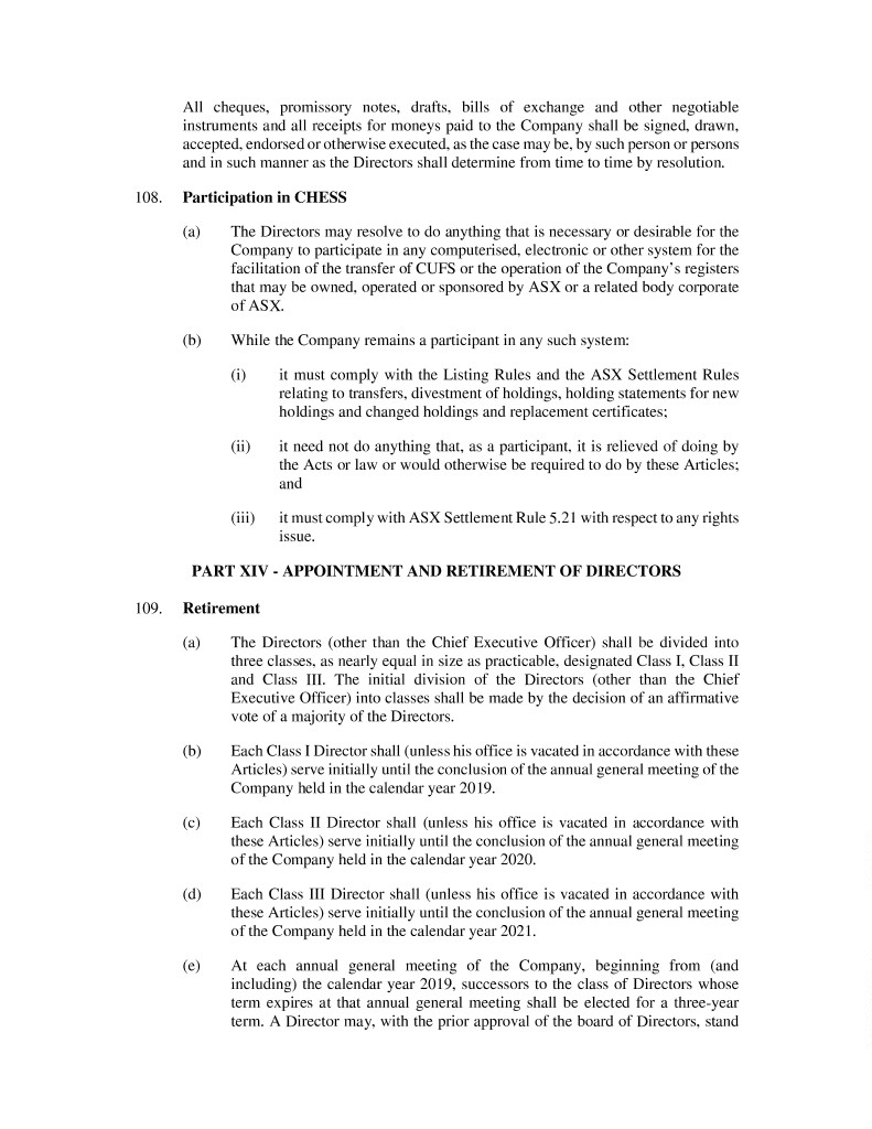 All cheques, promissory notes, drafts, bills of exchange and other negotiable instruments and all receipts for moneys paid to the Company shall be signed, drawn, accepted, endorsed or otherwise executed, as the case may be, by such person or persons and in such manner as the Directors shall determine from time to time by resolution. 108. Participation in CHESS (a) The Directors may resolve to do anything that is necessary or desirable for the Company to participate in any computerised, electronic or other system for the facilitation of the transfer of CUFS or the operation of the Company’s registers that may be owned, operated or sponsored by ASX or a related body corporate of ASX. (b) While the Company remains a participant in any such system: (i) it must comply with the Listing Rules and the ASX Settlement Rules relating to transfers, divestment of holdings, holding statements for new holdings and changed holdings and replacement certificates; (ii) it need not do anything that, as a participant, it is relieved of doing by the Acts or law or would otherwise be required to do by these Articles; and (iii) it must comply with ASX Settlement Rule 5.21 with respect to any rights issue. PART XIV - APPOINTMENT AND RETIREMENT OF DIRECTORS 109. Retirement (a) The Directors (other than the Chief Executive Officer) shall be divided into three classes, as nearly equal in size as practicable, designated Class I, Class II and Class III. The initial division of the Directors (other than the Chief Executive Officer) into classes shall be made by the decision of an affirmative vote of a majority of the Directors. (b) Each Class I Director shall (unless his office is vacated in accordance with these Articles) serve initially until the conclusion of the annual general meeting of the Company held in the calendar year 2019. (c) Each Class II Director shall (unless his office is vacated in accordance with these Articles) serve initially until the conclusion of the annual general meeting of the Company held in the calendar year 2020. (d) Each Class III Director shall (unless his office is vacated in accordance with these Articles) serve initially until the conclusion of the annual general meeting of the Company held in the calendar year 2021. (e) At each annual general meeting of the Company, beginning from (and including) the calendar year 2019, successors to the class of Directors whose term expires at that annual general meeting shall be elected for a three-year term. A Director may, with the prior approval of the board of Directors, stand