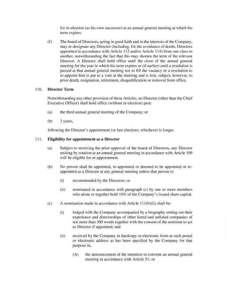 for re-election (as his own successor) at an annual general meeting at which his term expires. (f) The board of Directors, acting in good faith and in the interests of the Company, may re-designate any Director (including, for the avoidance of doubt, Directors appointed in accordance with Article 112 and/or Article 114) from one class to another, notwithstanding the fact that this may shorten the term of the relevant Director. A Director shall hold office until the close of the annual general meeting for the year in which his term expires or (if earlier) until a resolution is passed at that annual general meeting not to fill the vacancy or a resolution to re-appoint him is put to a vote at the meeting and is lost, subject, however, to prior death, resignation, retirement, disqualification or removal from office. 110. Director Term Notwithstanding any other provision of these Articles, no Director (other than the Chief Executive Officer) shall hold office (without re-election) past: (a) the third annual general meeting of the Company; or (b) 3 years, following the Director’s appointment (or last election), whichever is longer. 111. Eligibility for appointment as a Director (a) Subject to receiving the prior approval of the board of Directors, any Director retiring by rotation at an annual general meeting in accordance with Article 109 will be eligible for re-appointment. (b) No person shall be appointed, re-appointed or deemed to be appointed or re- appointed as a Director at any general meeting unless that person is: (i) recommended by the Directors; or (ii) nominated in accordance with paragraph (c) by one or more members who alone or together hold 10% of the Company’s issued share capital. (c) A nomination made in accordance with Article 111(b)(ii) shall be: (i) lodged with the Company accompanied by a biography setting out their experience and directorships of other listed and unlisted companies of not more than 300 words together with the consent of the nominee to act as Director if appointed; and (ii) received by the Company in hardcopy or electronic form at such postal or electronic address as has been specified by the Company for that purpose in, (A) the announcement of the intention to convene an annual general meeting in accordance with Article 51; or