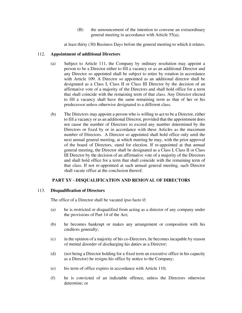 (B) the announcement of the intention to convene an extraordinary general meeting in accordance with Article 55(a), at least thirty (30) Business Days before the general meeting to which it relates. 112. Appointment of additional Directors (a) Subject to Article 111, the Company by ordinary resolution may appoint a person to be a Director either to fill a vacancy or as an additional Director and any Director so appointed shall be subject to retire by rotation in accordance with Article 109. A Director so appointed as an additional director shall be designated as a Class I, Class II or Class III Director by the decision of an affirmative vote of a majority of the Directors and shall hold office for a term that shall coincide with the remaining term of that class. Any Director elected to fill a vacancy shall have the same remaining term as that of her or his predecessor unless otherwise designated to a different class. (b) The Directors may appoint a person who is willing to act to be a Director, either to fill a vacancy or as an additional Director, provided that the appointment does not cause the number of Directors to exceed any number determined by the Directors or fixed by or in accordance with these Articles as the maximum number of Directors. A Director so appointed shall hold office only until the next annual general meeting, at which meeting he may, with the prior approval of the board of Directors, stand for election. If re-appointed at that annual general meeting, the Director shall be designated as a Class I, Class II or Class III Director by the decision of an affirmative vote of a majority of the Directors and shall hold office for a term that shall coincide with the remaining term of that class. If not re-appointed at such annual general meeting, such Director shall vacate office at the conclusion thereof. PART XV - DISQUALIFICATION AND REMOVAL OF DIRECTORS 113. Disqualification of Directors The office of a Director shall be vacated ipso facto if: (a) he is restricted or disqualified from acting as a director of any company under the provisions of Part 14 of the Act; (b) he becomes bankrupt or makes any arrangement or composition with his creditors generally; (c) in the opinion of a majority of his co-Directors, he becomes incapable by reason of mental disorder of discharging his duties as a Director; (d) (not being a Director holding for a fixed term an executive office in his capacity as a Director) he resigns his office by notice to the Company; (e) his term of office expires in accordance with Article 110; (f) he is convicted of an indictable offence, unless the Directors otherwise determine; or