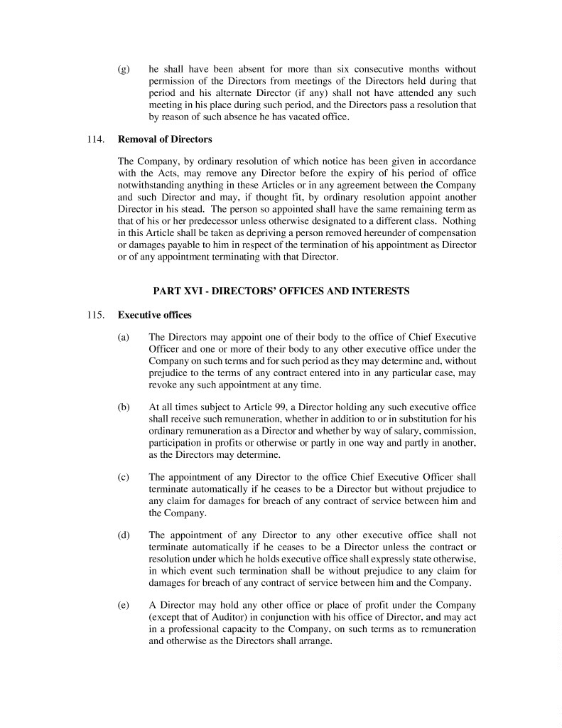 (g) he shall have been absent for more than six consecutive months without permission of the Directors from meetings of the Directors held during that period and his alternate Director (if any) shall not have attended any such meeting in his place during such period, and the Directors pass a resolution that by reason of such absence he has vacated office. 114. Removal of Directors The Company, by ordinary resolution of which notice has been given in accordance with the Acts, may remove any Director before the expiry of his period of office notwithstanding anything in these Articles or in any agreement between the Company and such Director and may, if thought fit, by ordinary resolution appoint another Director in his stead. The person so appointed shall have the same remaining term as that of his or her predecessor unless otherwise designated to a different class. Nothing in this Article shall be taken as depriving a person removed hereunder of compensation or damages payable to him in respect of the termination of his appointment as Director or of any appointment terminating with that Director. PART XVI - DIRECTORS’ OFFICES AND INTERESTS 115. Executive offices (a) The Directors may appoint one of their body to the office of Chief Executive Officer and one or more of their body to any other executive office under the Company on such terms and for such period as they may determine and, without prejudice to the terms of any contract entered into in any particular case, may revoke any such appointment at any time. (b) At all times subject to Article 99, a Director holding any such executive office shall receive such remuneration, whether in addition to or in substitution for his ordinary remuneration as a Director and whether by way of salary, commission, participation in profits or otherwise or partly in one way and partly in another, as the Directors may determine. (c) The appointment of any Director to the office Chief Executive Officer shall terminate automatically if he ceases to be a Director but without prejudice to any claim for damages for breach of any contract of service between him and the Company. (d) The appointment of any Director to any other executive office shall not terminate automatically if he ceases to be a Director unless the contract or resolution under which he holds executive office shall expressly state otherwise, in which event such termination shall be without prejudice to any claim for damages for breach of any contract of service between him and the Company. (e) A Director may hold any other office or place of profit under the Company (except that of Auditor) in conjunction with his office of Director, and may act in a professional capacity to the Company, on such terms as to remuneration and otherwise as the Directors shall arrange.