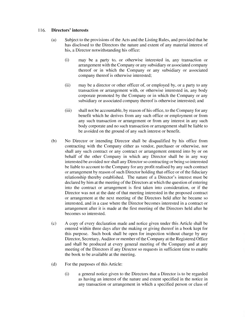116. Directors’ interests (a) Subject to the provisions of the Acts and the Listing Rules, and provided that he has disclosed to the Directors the nature and extent of any material interest of his, a Director notwithstanding his office: (i) may be a party to, or otherwise interested in, any transaction or arrangement with the Company or any subsidiary or associated company thereof or in which the Company or any subsidiary or associated company thereof is otherwise interested; (ii) may be a director or other officer of, or employed by, or a party to any transaction or arrangement with, or otherwise interested in, any body corporate promoted by the Company or in which the Company or any subsidiary or associated company thereof is otherwise interested; and (iii) shall not be accountable, by reason of his office, to the Company for any benefit which he derives from any such office or employment or from any such transaction or arrangement or from any interest in any such body corporate and no such transaction or arrangement shall be liable to be avoided on the ground of any such interest or benefit. (b) No Director or intending Director shall be disqualified by his office from contracting with the Company either as vendor, purchaser or otherwise, nor shall any such contract or any contract or arrangement entered into by or on behalf of the other Company in which any Director shall be in any way interested be avoided nor shall any Director so contracting or being so interested be liable to account to the Company for any profit realised by any such contract or arrangement by reason of such Director holding that office or of the fiduciary relationship thereby established. The nature of a Director’s interest must be declared by him at the meeting of the Directors at which the question of entering into the contract or arrangement is first taken into consideration, or if the Director was not at the date of that meeting interested in the proposed contract or arrangement at the next meeting of the Directors held after he became so interested, and in a case where the Director becomes interested in a contract or arrangement after it is made at the first meeting of the Directors held after he becomes so interested. (c) A copy of every declaration made and notice given under this Article shall be entered within three days after the making or giving thereof in a book kept for this purpose. Such book shall be open for inspection without charge by any Director, Secretary, Auditor or member of the Company at the Registered Office and shall be produced at every general meeting of the Company and at any meeting of the Directors if any Director so requests in sufficient time to enable the book to be available at the meeting. (d) For the purposes of this Article: (i) a general notice given to the Directors that a Director is to be regarded as having an interest of the nature and extent specified in the notice in any transaction or arrangement in which a specified person or class of