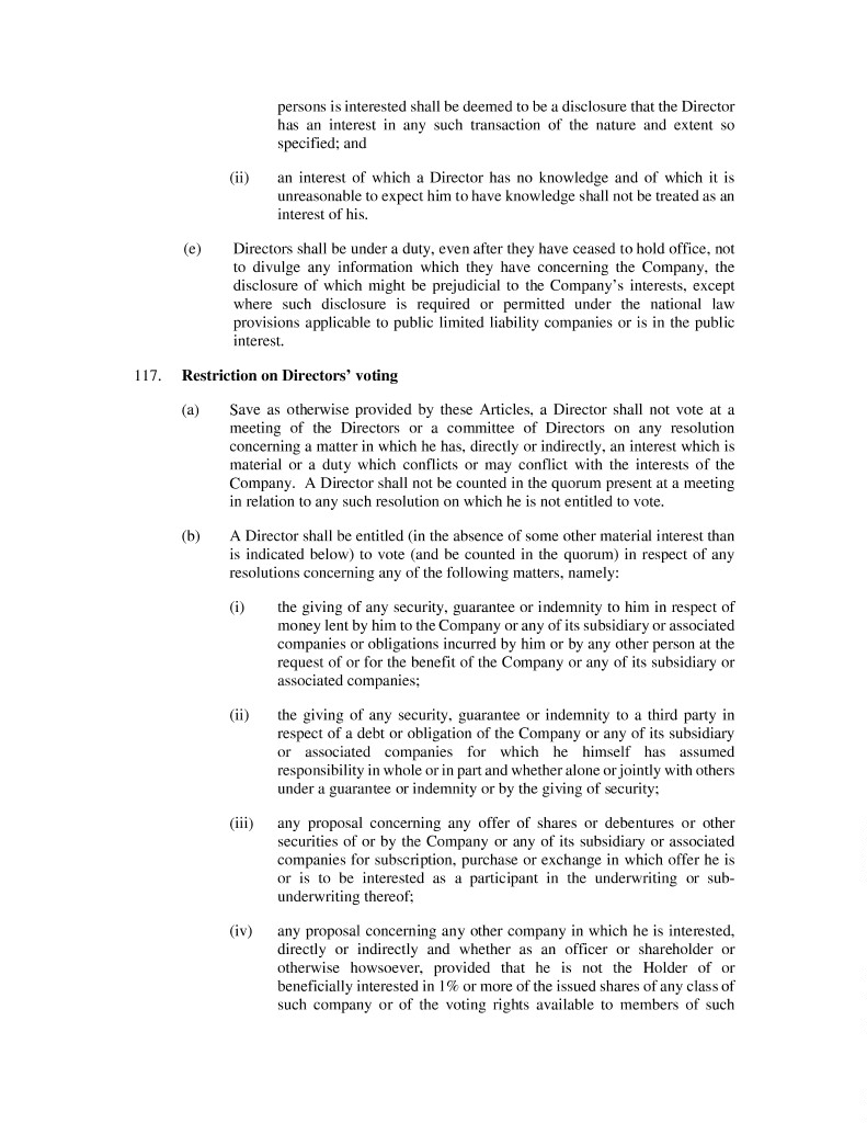 persons is interested shall be deemed to be a disclosure that the Director has an interest in any such transaction of the nature and extent so specified; and (ii) an interest of which a Director has no knowledge and of which it is unreasonable to expect him to have knowledge shall not be treated as an interest of his. (e) Directors shall be under a duty, even after they have ceased to hold office, not to divulge any information which they have concerning the Company, the disclosure of which might be prejudicial to the Company’s interests, except where such disclosure is required or permitted under the national law provisions applicable to public limited liability companies or is in the public interest. 117. Restriction on Directors’ voting (a) Save as otherwise provided by these Articles, a Director shall not vote at a meeting of the Directors or a committee of Directors on any resolution concerning a matter in which he has, directly or indirectly, an interest which is material or a duty which conflicts or may conflict with the interests of the Company. A Director shall not be counted in the quorum present at a meeting in relation to any such resolution on which he is not entitled to vote. (b) A Director shall be entitled (in the absence of some other material interest than is indicated below) to vote (and be counted in the quorum) in respect of any resolutions concerning any of the following matters, namely: (i) the giving of any security, guarantee or indemnity to him in respect of money lent by him to the Company or any of its subsidiary or associated companies or obligations incurred by him or by any other person at the request of or for the benefit of the Company or any of its subsidiary or associated companies; (ii) the giving of any security, guarantee or indemnity to a third party in respect of a debt or obligation of the Company or any of its subsidiary or associated companies for which he himself has assumed responsibility in whole or in part and whether alone or jointly with others under a guarantee or indemnity or by the giving of security; (iii) any proposal concerning any offer of shares or debentures or other securities of or by the Company or any of its subsidiary or associated companies for subscription, purchase or exchange in which offer he is or is to be interested as a participant in the underwriting or sub- underwriting thereof; (iv) any proposal concerning any other company in which he is interested, directly or indirectly and whether as an officer or shareholder or otherwise howsoever, provided that he is not the Holder of or beneficially interested in 1% or more of the issued shares of any class of such company or of the voting rights available to members of such
