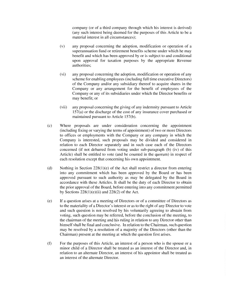 company (or of a third company through which his interest is derived) (any such interest being deemed for the purposes of this Article to be a material interest in all circumstances); (v) any proposal concerning the adoption, modification or operation of a superannuation fund or retirement benefits scheme under which he may benefit and which has been approved by or is subject to and conditional upon approval for taxation purposes by the appropriate Revenue authorities; (vi) any proposal concerning the adoption, modification or operation of any scheme for enabling employees (including full time executive Directors) of the Company and/or any subsidiary thereof to acquire shares in the Company or any arrangement for the benefit of employees of the Company or any of its subsidiaries under which the Director benefits or may benefit; or (vii) any proposal concerning the giving of any indemnity pursuant to Article 157(a) or the discharge of the cost of any insurance cover purchased or maintained pursuant to Article 157(b). (c) Where proposals are under consideration concerning the appointment (including fixing or varying the terms of appointment) of two or more Directors to offices or employments with the Company or any company in which the Company is interested, such proposals may be divided and considered in relation to each Director separately and in such case each of the Directors concerned (if not debarred from voting under sub-paragraph (b) (iv) of this Article) shall be entitled to vote (and be counted in the quorum) in respect of each resolution except that concerning his own appointment. (d) Nothing in Section 228(1)(e) of the Act shall restrict a director from entering into any commitment which has been approved by the Board or has been approved pursuant to such authority as may be delegated by the Board in accordance with these Articles. It shall be the duty of each Director to obtain the prior approval of the Board, before entering into any commitment permitted by Sections 228(1)(e)(ii) and 228(2) of the Act. (e) If a question arises at a meeting of Directors or of a committee of Directors as to the materiality of a Director’s interest or as to the right of any Director to vote and such question is not resolved by his voluntarily agreeing to abstain from voting, such question may be referred, before the conclusion of the meeting, to the chairman of the meeting and his ruling in relation to any Director other than himself shall be final and conclusive. In relation to the Chairman, such question may be resolved by a resolution of a majority of the Directors (other than the Chairman) present at the meeting at which the question first arises. (f) For the purposes of this Article, an interest of a person who is the spouse or a minor child of a Director shall be treated as an interest of the Director and, in relation to an alternate Director, an interest of his appointor shall be treated as an interest of the alternate Director.