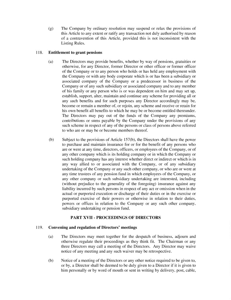 (g) The Company by ordinary resolution may suspend or relax the provisions of this Article to any extent or ratify any transaction not duly authorised by reason of a contravention of this Article, provided this is not inconsistent with the Listing Rules. 118. Entitlement to grant pensions (a) The Directors may provide benefits, whether by way of pensions, gratuities or otherwise, for any Director, former Director or other officer or former officer of the Company or to any person who holds or has held any employment with the Company or with any body corporate which is or has been a subsidiary or associated company of the Company or a predecessor in business of the Company or of any such subsidiary or associated company and to any member of his family or any person who is or was dependent on him and may set up, establish, support, alter, maintain and continue any scheme for providing all or any such benefits and for such purposes any Director accordingly may be, become or remain a member of, or rejoin, any scheme and receive or retain for his own benefit all benefits to which he may be or become entitled thereunder. The Directors may pay out of the funds of the Company any premiums, contributions or sums payable by the Company under the provisions of any such scheme in respect of any of the persons or class of persons above referred to who are or may be or become members thereof. (b) Subject to the provisions of Article 157(b), the Directors shall have the power to purchase and maintain insurance for or for the benefit of any persons who are or were at any time, directors, officers, or employees of the Company, or of any other company which is its holding company or in which the Company or such holding company has any interest whether direct or indirect or which is in any way allied to or associated with the Company, or of any subsidiary undertaking of the Company or any such other company, or who are or were at any time trustees of any pension fund in which employees of the Company, or any other company or such subsidiary undertaking are interested, including (without prejudice to the generality of the foregoing) insurance against any liability incurred by such persons in respect of any act or omission when in the actual or purported execution or discharge of their duties or in the exercise or purported exercise of their powers or otherwise in relation to their duties, powers or offices in relation to the Company or any such other company, subsidiary undertaking or pension fund. PART XVII - PROCEEDINGS OF DIRECTORS 119. Convening and regulation of Directors’ meetings (a) The Directors may meet together for the despatch of business, adjourn and otherwise regulate their proceedings as they think fit. The Chairman or any three Directors may call a meeting of the Directors. Any Director may waive notice of any meeting and any such waiver may be retrospective. (b) Notice of a meeting of the Directors or any other notice required to be given to, or by, a Director shall be deemed to be duly given to a Director if it is given to him personally or by word of mouth or sent in writing by delivery, post, cable,