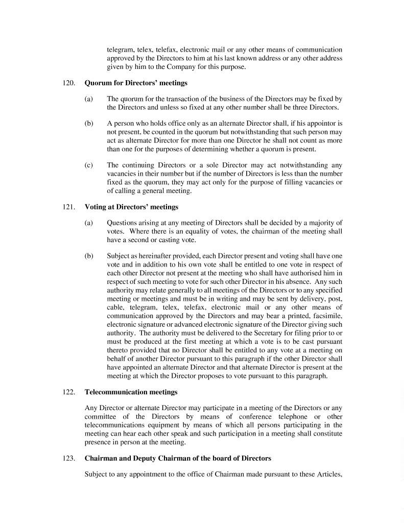 telegram, telex, telefax, electronic mail or any other means of communication approved by the Directors to him at his last known address or any other address given by him to the Company for this purpose. 120. Quorum for Directors’ meetings (a) The quorum for the transaction of the business of the Directors may be fixed by the Directors and unless so fixed at any other number shall be three Directors. (b) A person who holds office only as an alternate Director shall, if his appointor is not present, be counted in the quorum but notwithstanding that such person may act as alternate Director for more than one Director he shall not count as more than one for the purposes of determining whether a quorum is present. (c) The continuing Directors or a sole Director may act notwithstanding any vacancies in their number but if the number of Directors is less than the number fixed as the quorum, they may act only for the purpose of filling vacancies or of calling a general meeting. 121. Voting at Directors’ meetings (a) Questions arising at any meeting of Directors shall be decided by a majority of votes. Where there is an equality of votes, the chairman of the meeting shall have a second or casting vote. (b) Subject as hereinafter provided, each Director present and voting shall have one vote and in addition to his own vote shall be entitled to one vote in respect of each other Director not present at the meeting who shall have authorised him in respect of such meeting to vote for such other Director in his absence. Any such authority may relate generally to all meetings of the Directors or to any specified meeting or meetings and must be in writing and may be sent by delivery, post, cable, telegram, telex, telefax, electronic mail or any other means of communication approved by the Directors and may bear a printed, facsimile, electronic signature or advanced electronic signature of the Director giving such authority. The authority must be delivered to the Secretary for filing prior to or must be produced at the first meeting at which a vote is to be cast pursuant thereto provided that no Director shall be entitled to any vote at a meeting on behalf of another Director pursuant to this paragraph if the other Director shall have appointed an alternate Director and that alternate Director is present at the meeting at which the Director proposes to vote pursuant to this paragraph. 122. Telecommunication meetings Any Director or alternate Director may participate in a meeting of the Directors or any committee of the Directors by means of conference telephone or other telecommunications equipment by means of which all persons participating in the meeting can hear each other speak and such participation in a meeting shall constitute presence in person at the meeting. 123. Chairman and Deputy Chairman of the board of Directors Subject to any appointment to the office of Chairman made pursuant to these Articles,